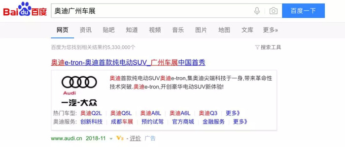 另一个侧面印证是,搜索“奥迪广州车展”或者“广州车展奥迪”,出来的第一条信息是奥迪自己投的广告:“奥迪e-tron-奥迪首款纯电动SUV_广州车展中国首秀”。似乎,就连奥迪自己,也没有把同场首发的全新奥迪A6L放在核心位置,这有点出人意料。
