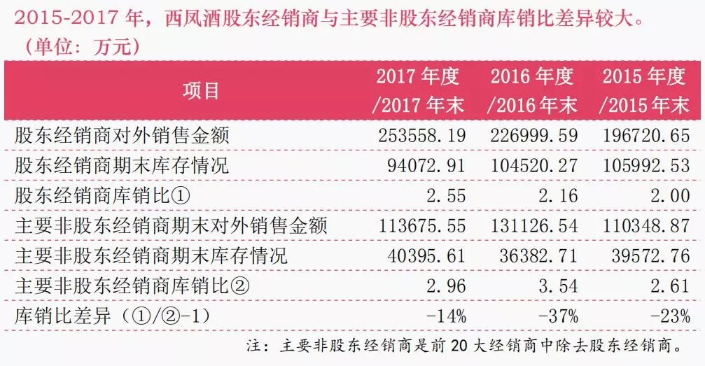 据招股书显示,2015-2017年,西凤酒的库销比无论是在股东还是在非股东经销商那里,都呈现逐年上涨的趋势,这意味着酒越来越不好卖。从金额上来看,在西凤酒近900家经销商中,这14家股东经销商,每年的库存量大约是主要非股东经销商的2~3倍。两者的库存比差异最高达到了37%,最低也有14%。