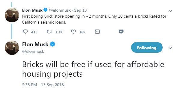 Boring公司开发新的隧道挖掘和交通技术,Brick Store公司则用这些挖掘机挖出来的土壤生产砖头。马斯克发推文称,这些砖头的价格可能只有10美分,甚至可以免费供廉租房项目使用。