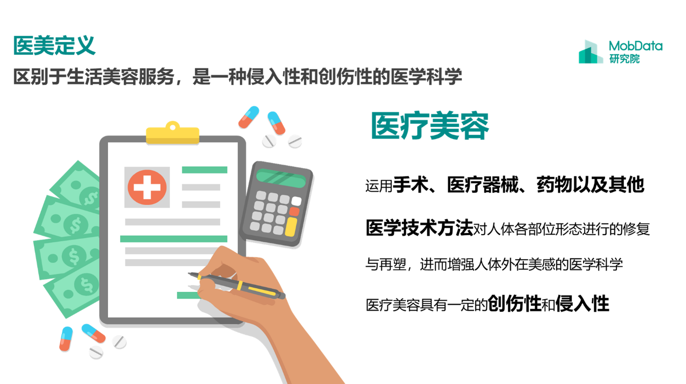 区别于生活美容服务,医美是一种侵入性和创伤性的医学科学。医疗美容是运用手术、医疗器械、药物以及其他医学技术方法对人体各部位进行修复与再塑,进而增强人体外在美感的医学科学。