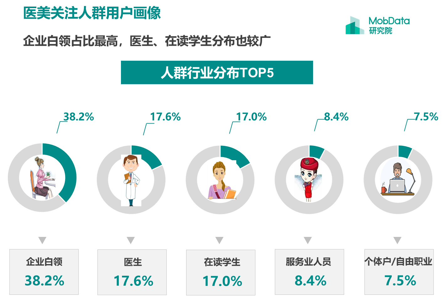 人群行业分布来看,企业白领占比最高,医生、在读学生分布也较广。