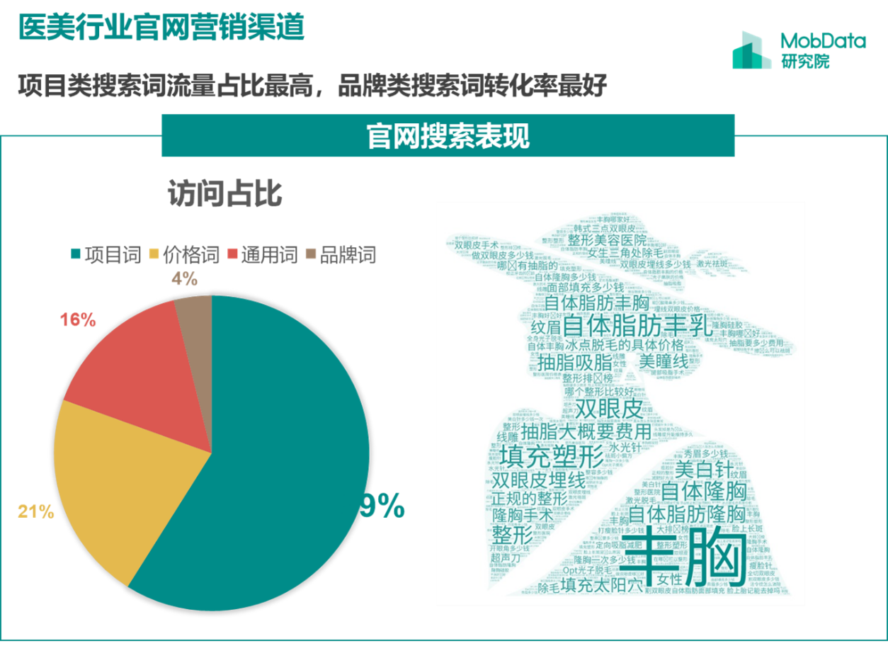 在搜索关键词中,项目类搜索词流量占比最高,品牌类搜索词转化率最好。 丰胸、双眼皮是热搜关键词。