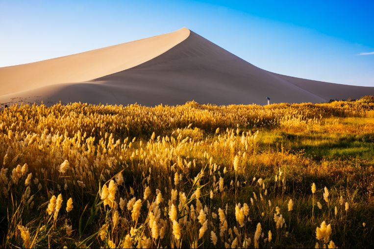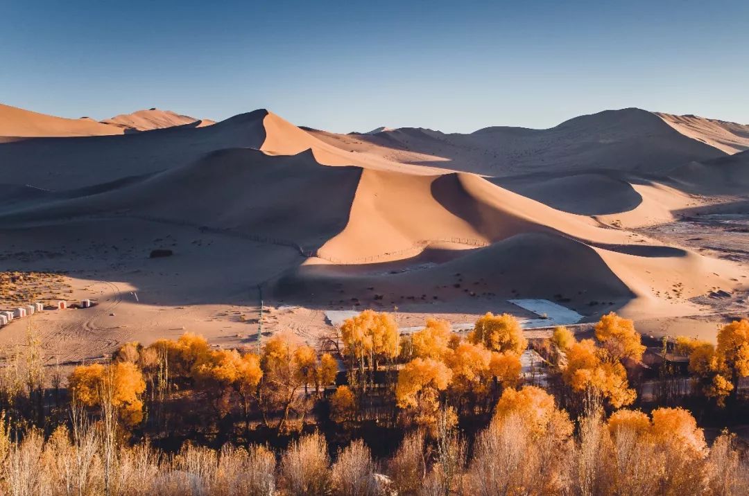 一路向北深入,我们会穿过敦煌古城。秋天的敦煌与周围植被仿佛融为一体,一片金碧辉煌。享受车胎与沙地发生的摩擦,哪怕沙地不稳,车胎也能牢牢地吸附于沙地,从而带给你最安全的驾驶体验。