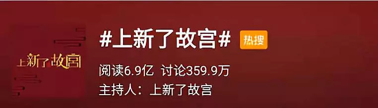 第二期热度依旧不减,微博热搜词#上新了故宫#持续霸榜23小时,话题#上新了故宫#位列微博总榜Top1、阅读量突破6.9亿。