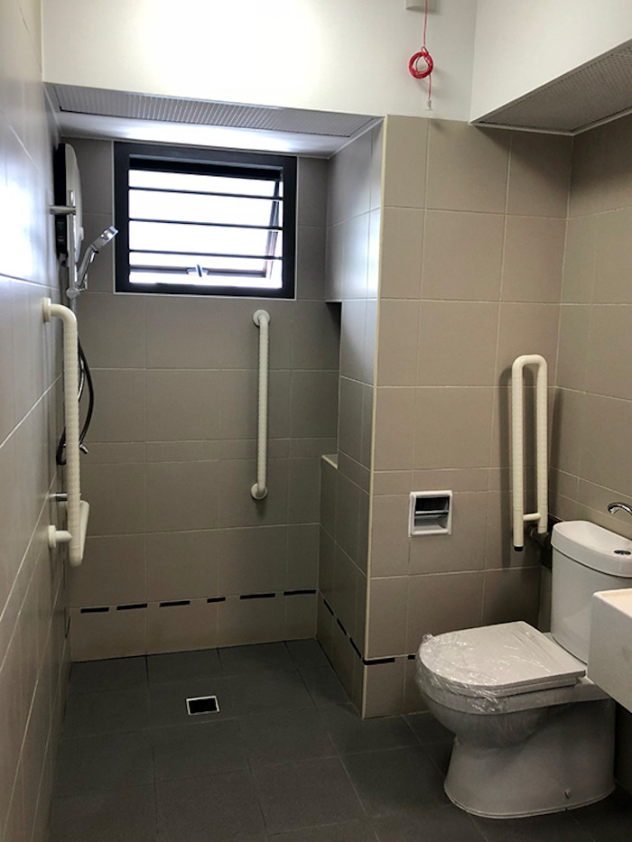 为保障老年人居住的舒适、安全,室内采取了通用设计,每个组屋房间内都配备有电磁炉、防滑地砖、扶手、伸缩式晾衣架、紧急呼救系统等设施。 客厅和卫生间靠墙位置还专为老人设置了紧急拉绳,“住户一旦发生紧急状况拉动绳子后,呼救信息就会显示在每层楼的电梯显示板上,不论是白天还是晚上,乐龄中心的工作人员都会及时前来处理。”陈譓圳说。