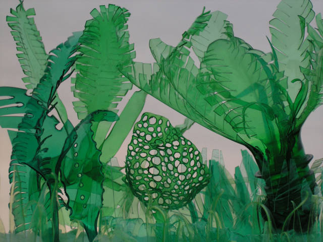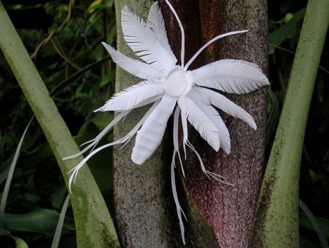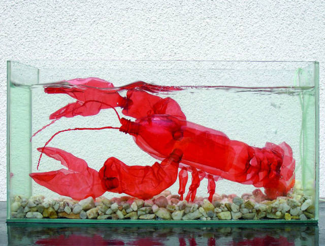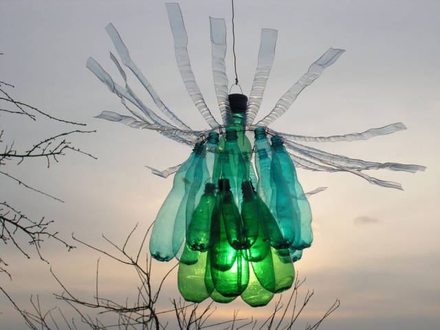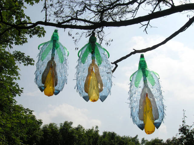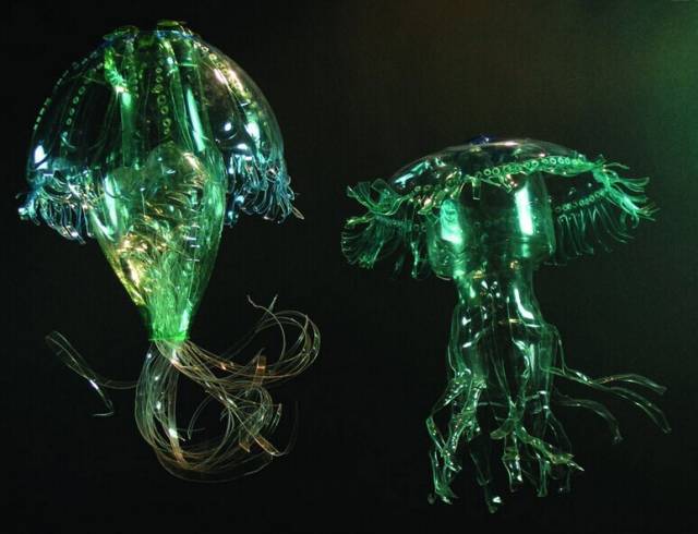 不仅仅是花,它们还能变身成为一只白色的飞蛾,一只有毒的雨蛙,或者一只萤绿色的水母,看着这些PET塑料瓶做成的动物,有木有一种置身北京798艺术区的感觉?