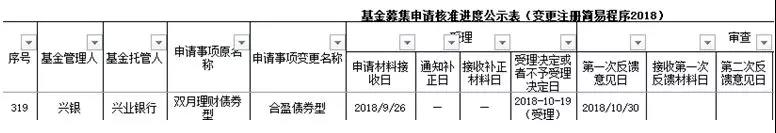 11月15日,易方达基金上报了公开募集基金募集变更注册申请,拟将易方达双月利理财债券基金变更为易方达安源中短债基金,目前仍处于接收材料阶段,9月26日,兴银基金也申请将旗下双月理财债券基金变更为合盈债券基金,在10月30日获得第一次反馈意见。无独有偶,也有基金公司递交旗下的短期理财基金变更注册申请,最新进展是收到补正通知。