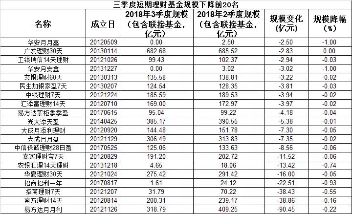 基金三季报数据同时显示,截止三季度末,61只短期理财基金合计规模6934.97亿元,相比二季度末下降3.06%,从绝对规模上看,易方达月月利、南方理财14天、招商理财7天规模分别下降90.45亿元、38.86亿元、38.43亿元,缩减规模位列行业前三;从规模降幅上看,嘉实1个月理财等三只短期理财基金现有规模为零,下降幅度高达100%。