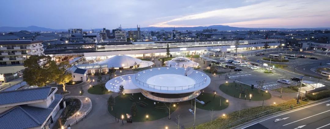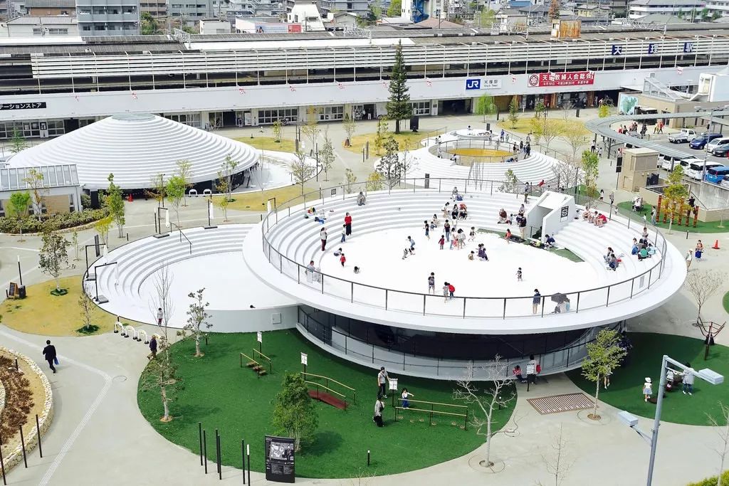 Nendo 团队在位于奈良县天理市的火车站旁设计了一个6000平米的公共广场空间,广场上布满了大大小小的圆盘,形状大小不一,错落有有致,非常有趣。