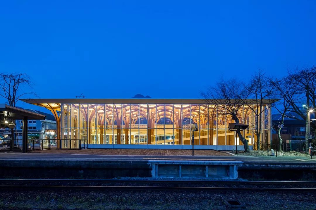 栃木県益子町新建了一个车站,从远处看,起伏的屋檐宛若群山,而硕大的落地玻璃窗户映照着蓝天,相当美丽。