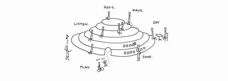 cofun结构不同的高度提供了多样的功能:它们是楼梯同时也是座位、保护玩耍孩童的栏杆,咖啡厅和舞台的屋顶,可以展示的架子以及夜晚的灯光照明。这种多样性创造了一个可以让人们探索并在广场中不同的空间消遣时光的环境,而不是某个封闭的空间。这是一个暧昧的空间,它可以是咖啡厅,广场甚至一个巨大的家具。