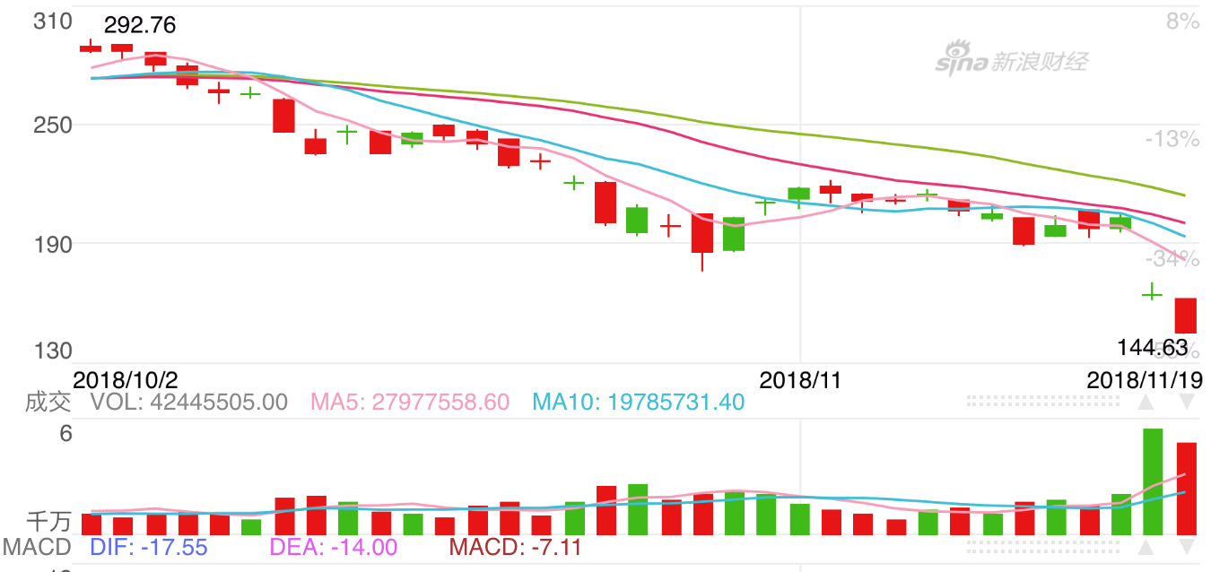 英伟达股价从一个月前的最高点292.76美元跌至目前最低点144.70美元