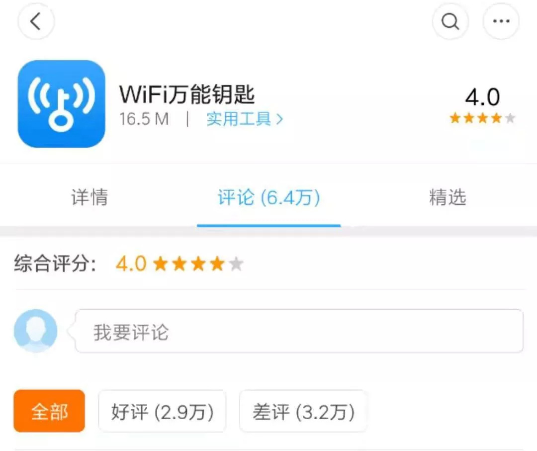 为了了解这里面的猫腻,我马上打开了自己的应用商店,搜索了一下WiFi万能钥匙。搜出来之后发现,应用商店的评分4.0,似乎还不错啊。不过等我仔细一看,2.9万的好评,3.2万的差评,这个4.0分…好像有点不对劲。