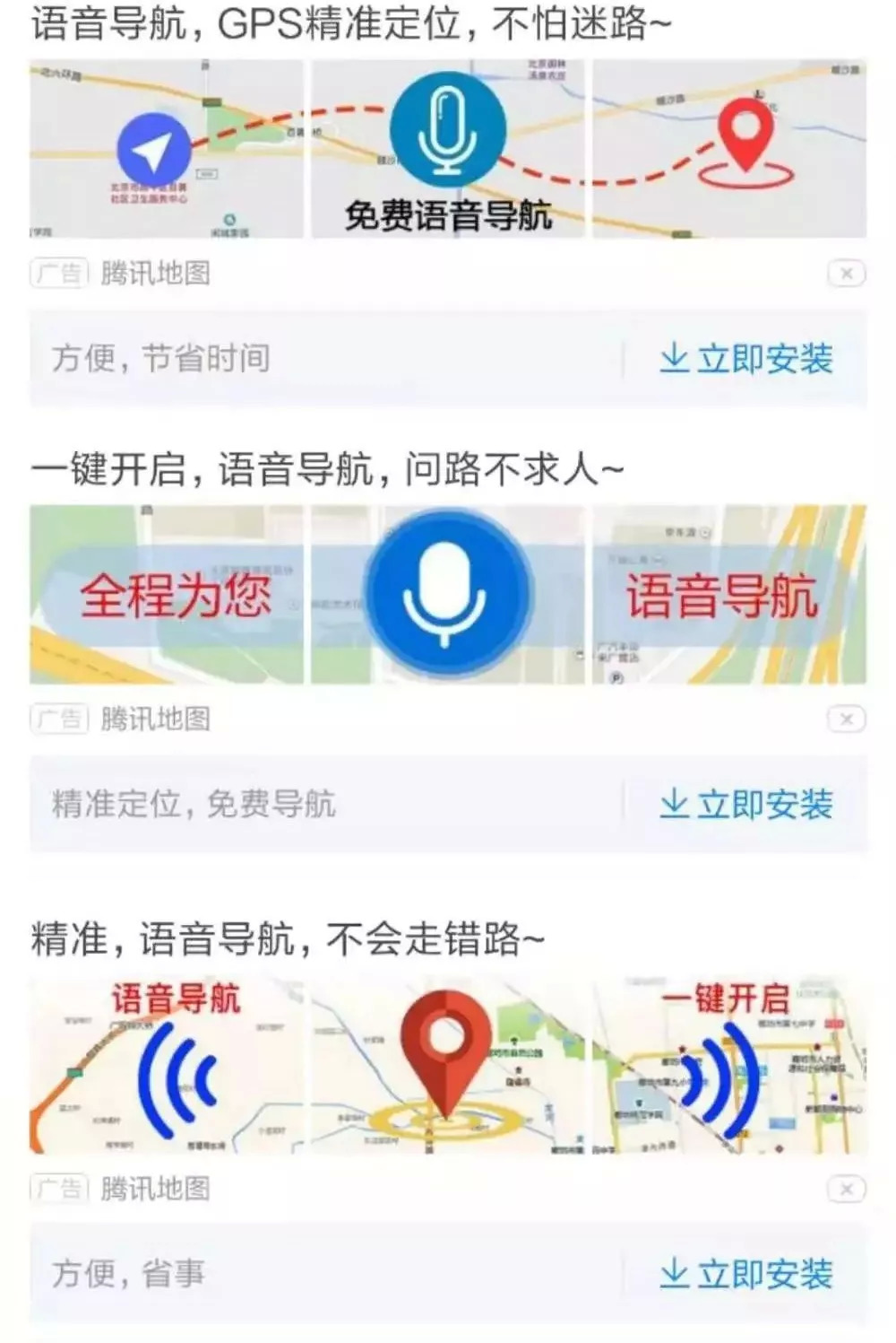 比如腾讯地图,在我简单下滑的过程中,至少就看见了它三条不一样的广告: