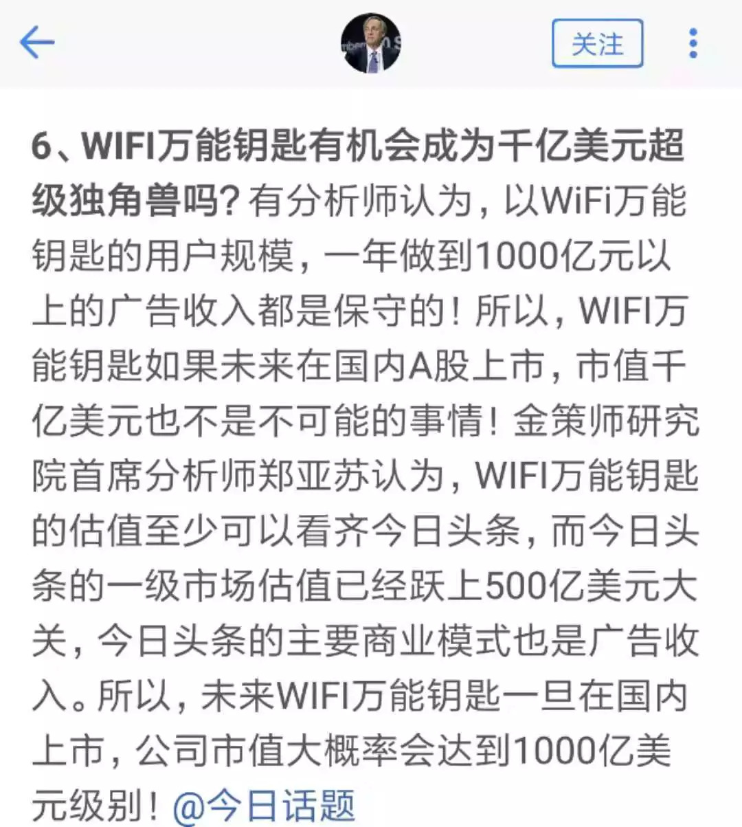 当时还有一名叫郑亚苏的大V(官方认证为上海季开投资管理有限公司总经理)曾经撰文表示,WiFi万能钥匙如果上市,其估值甚至可以与今日头条相提并论。如今看来,我却感觉这是今日头条被黑得最惨的一次。