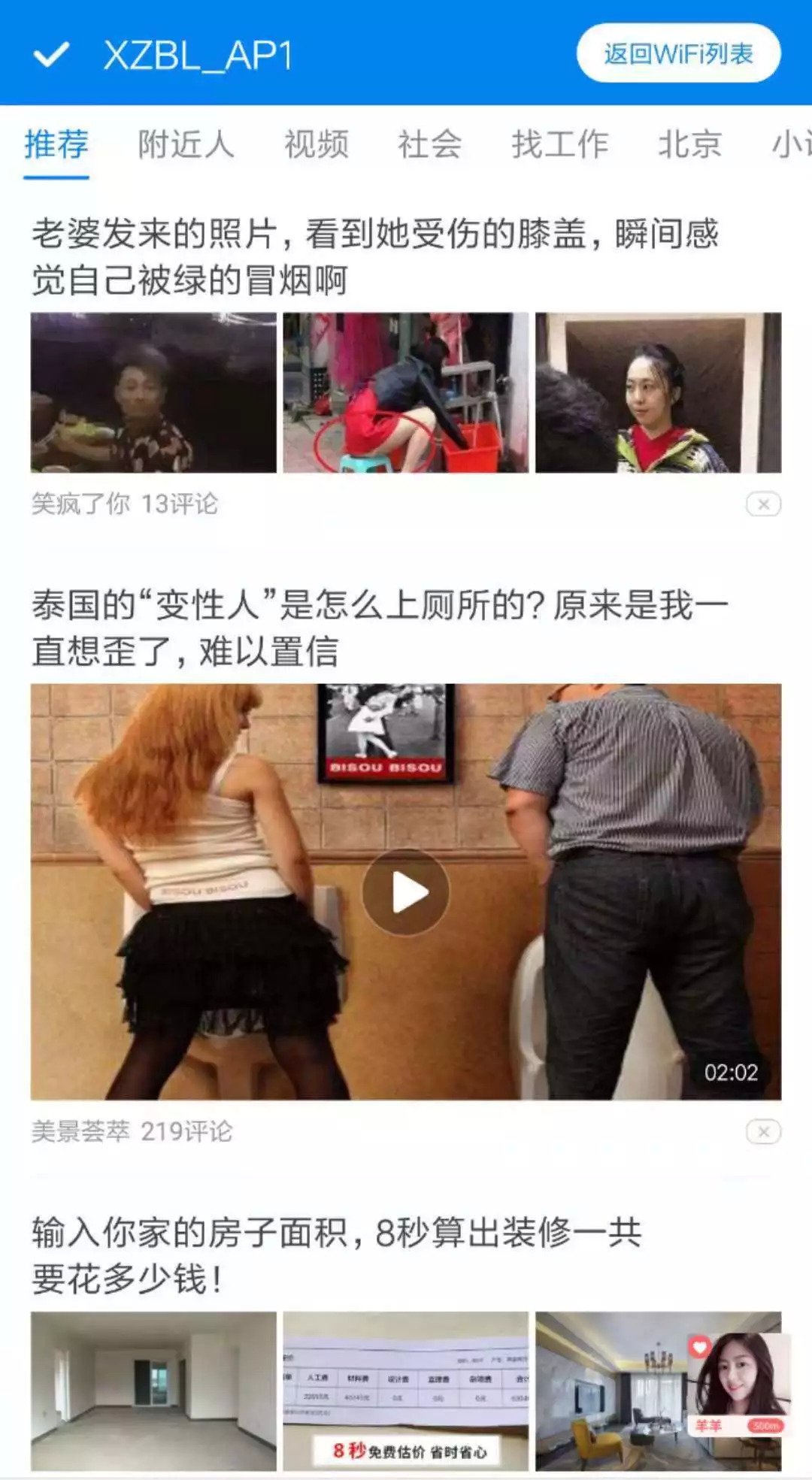 所以抱着没有调查就没有发言权的思维,我直接下载了一个WiFi万能钥匙,然后点进了首页。然后发现首页推荐第一条是:老婆发来的照片,看到她受伤的膝盖,瞬间感觉自己被绿得冒烟…