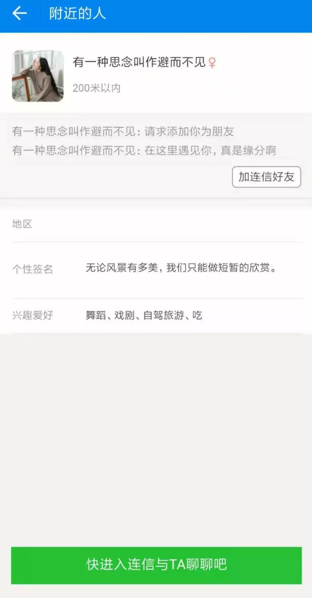在WiFi万能钥匙的顶部栏,推荐右侧排在第一的就是附近人,当我们点开这个栏目,呈现在眼前的场景是这样的: