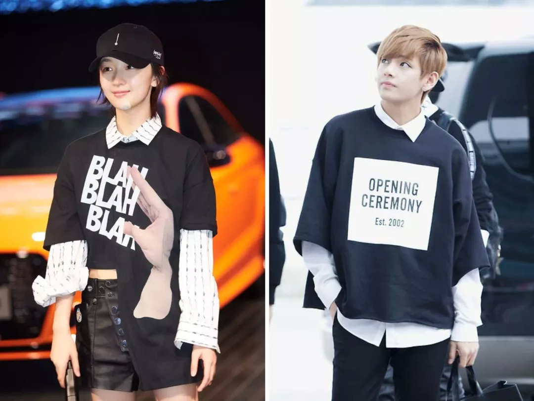 6. 较宽松的款式,可以像周冬雨和金泰亨这样,衬衫+T恤,相对来说更正一点!