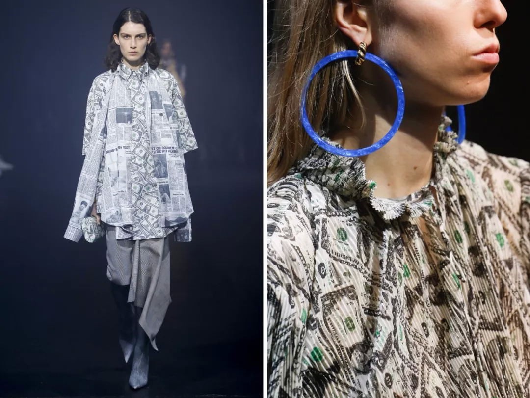 去年秋冬,巴黎世家把钞票和报纸整个大面积印在衣服上上,真的很浮夸有没有...
