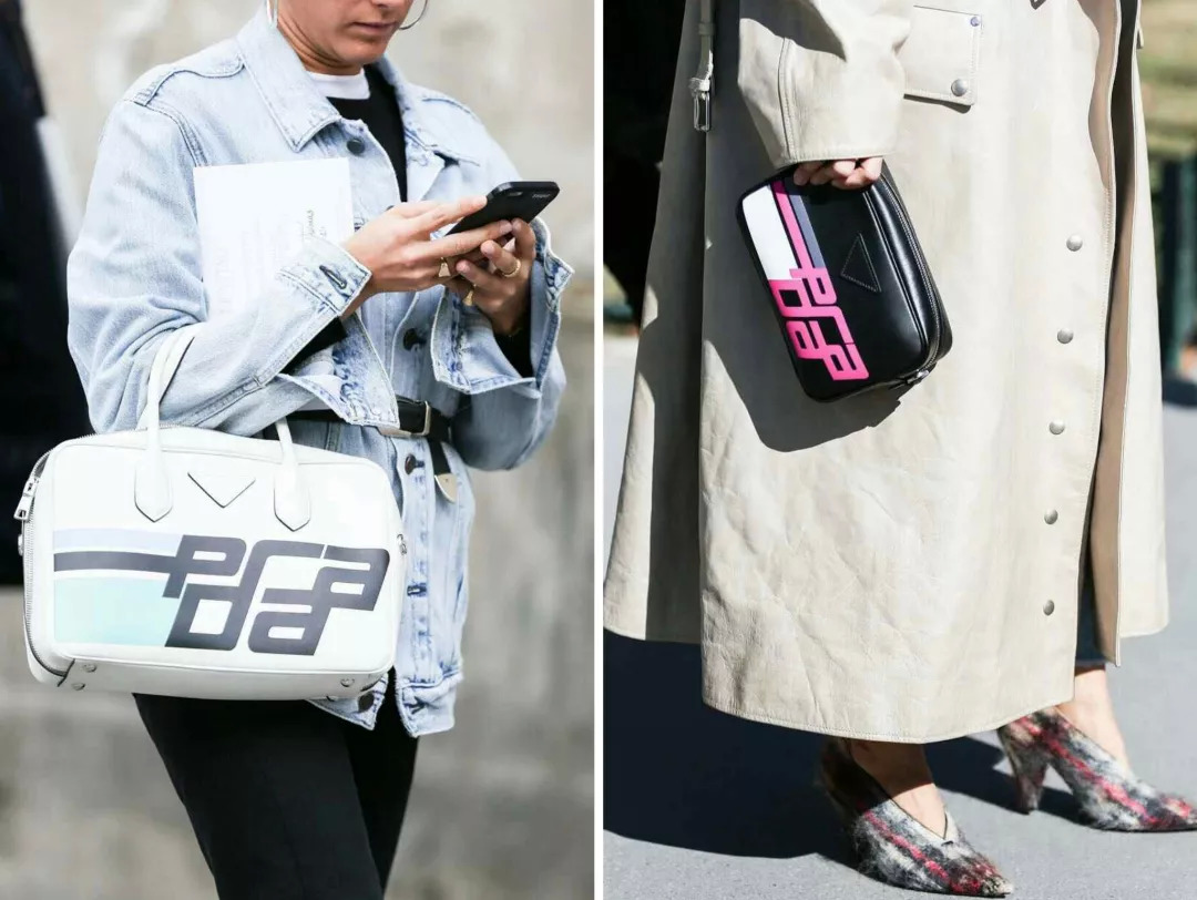 Prada最新系列,把原本金属质感的倒三角logo,换成印刷的荧光彩色字体,让包包更加运动风~