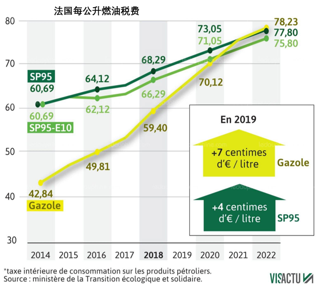 2013年,法国国家审计法院公布的一份审计报告中指出,法国汽油税费和柴油税费的差额为欧盟各国最高,当年每升柴油的税费为0.42欧元,每升汽油则为0.6欧元。在此背景下,奥朗德政府开始逐步推行汽柴油税费统一化。2016年,时任环境与能源部长罗亚尔(Marie-Ségolène Royal)在接受采访时表示:“政府的目标是使得柴油和汽油的价格趋同。但考虑到柴油工业的重要性,柴油税优惠仍将继续施行。”2017年,马克龙政府的激进环保主义者、前生态转型与团结部长尼古拉·于洛也再次重申了汽柴油价格趋同的目标,并将马克龙的第一个任期结束定为最终的时间表。