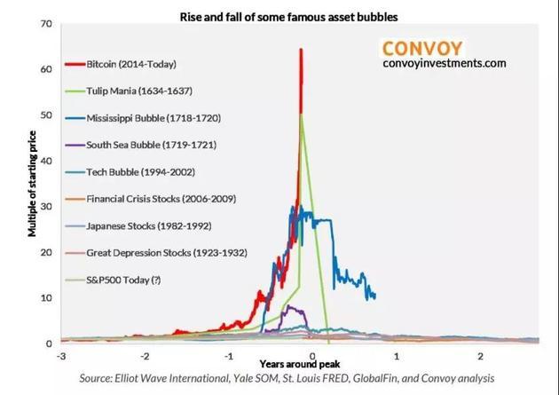 要知道在2010年,一份价值25美元的披萨就花掉了买主1万枚比特币,相当于一枚比特币价值0.25美分。七年时间身价暴涨400万倍,使得比特币超过荷兰“郁金香狂热”和英国“南海公司骗局”,成为人类历史上最大的一次资产泡沫。