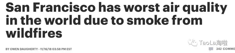 尤其是11月16日,整个旧金山市被乌黑、令人窒息的烟尘笼罩,当天下午测得空气质量指数(AQI)高达271,“极度危险”,是当天全世界范围内空气质量最差的城市。
