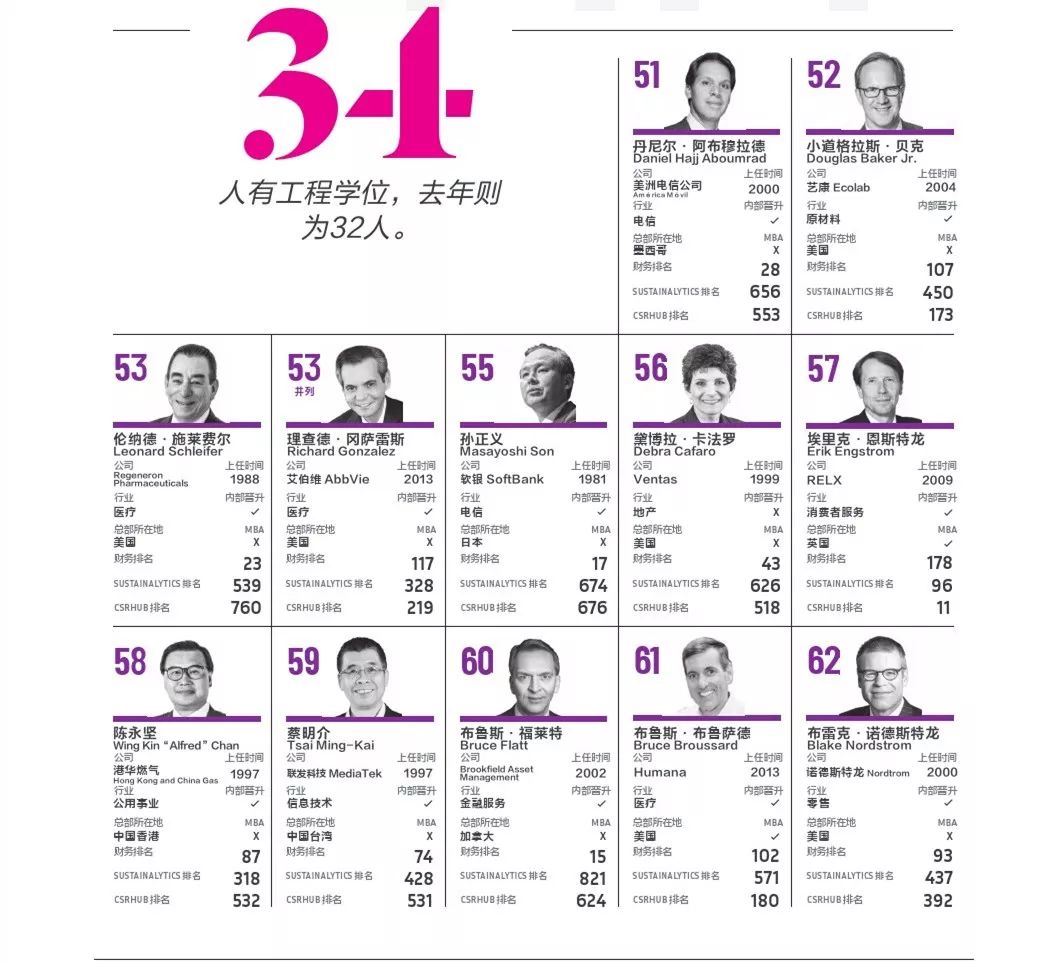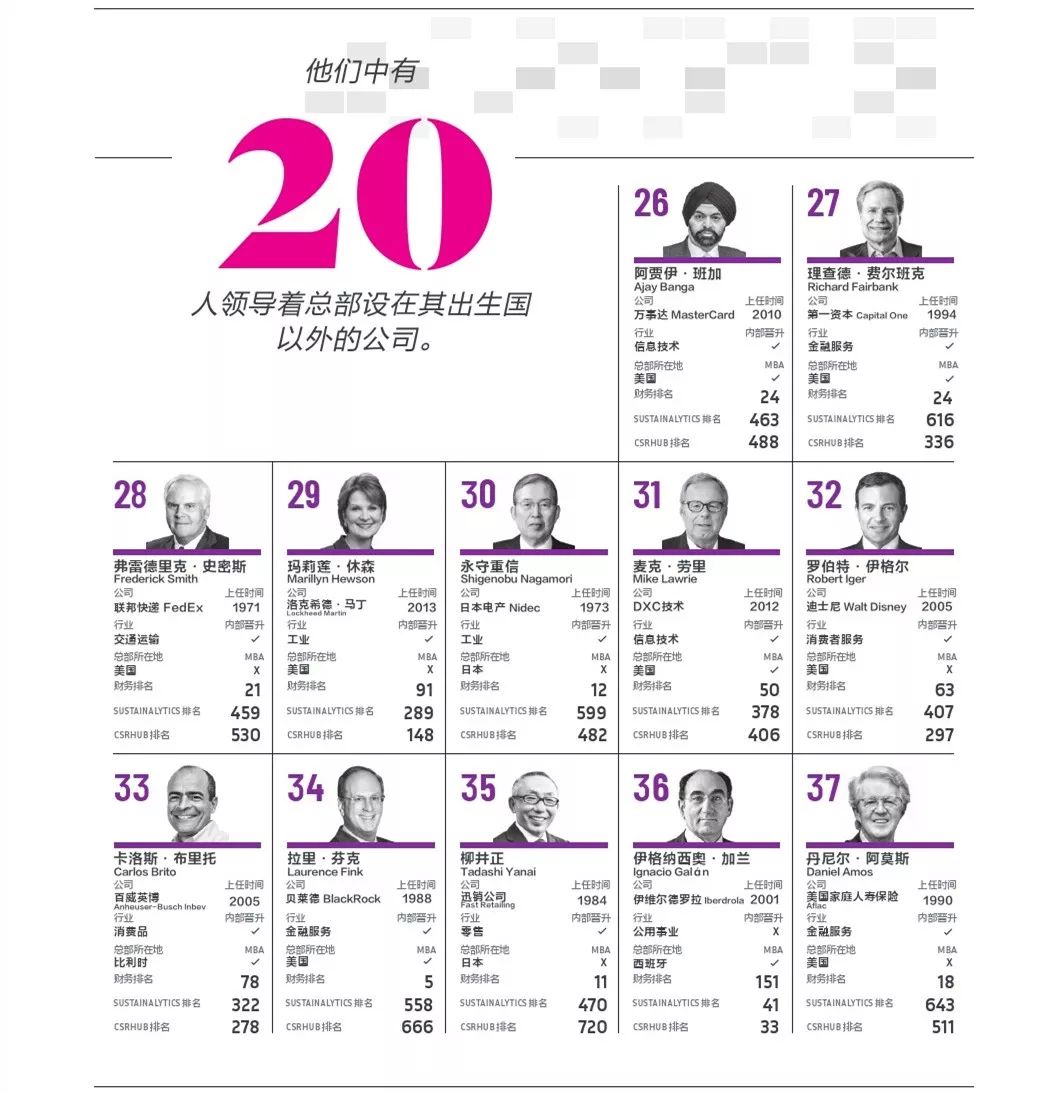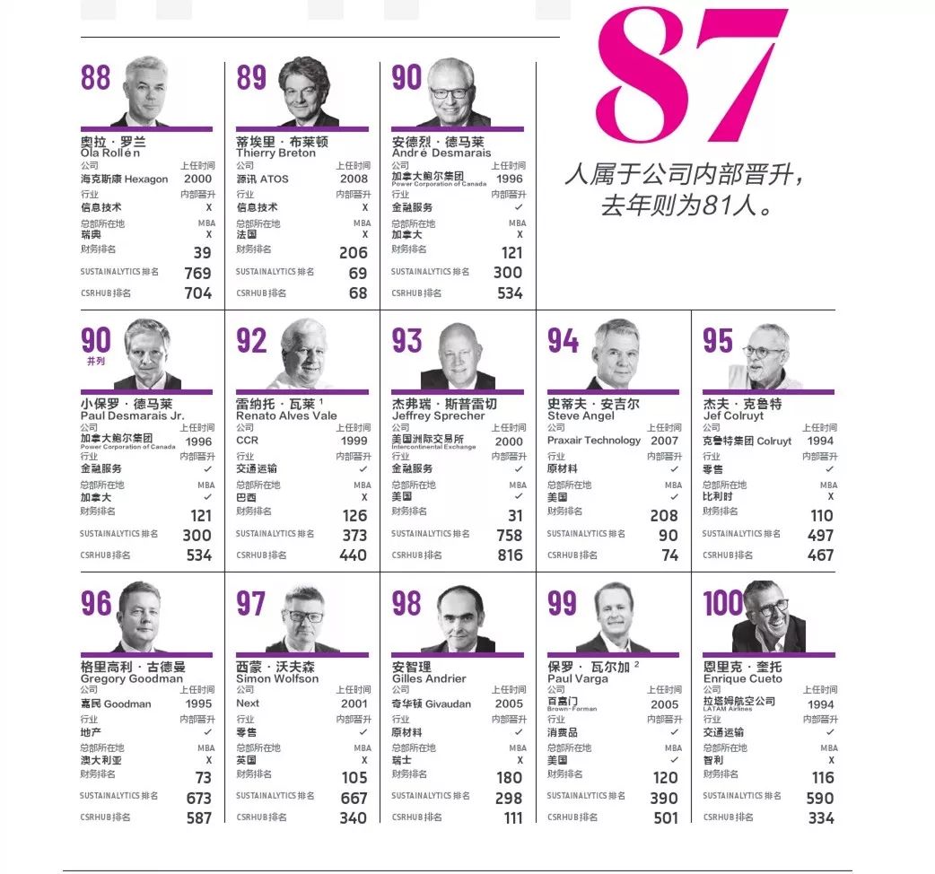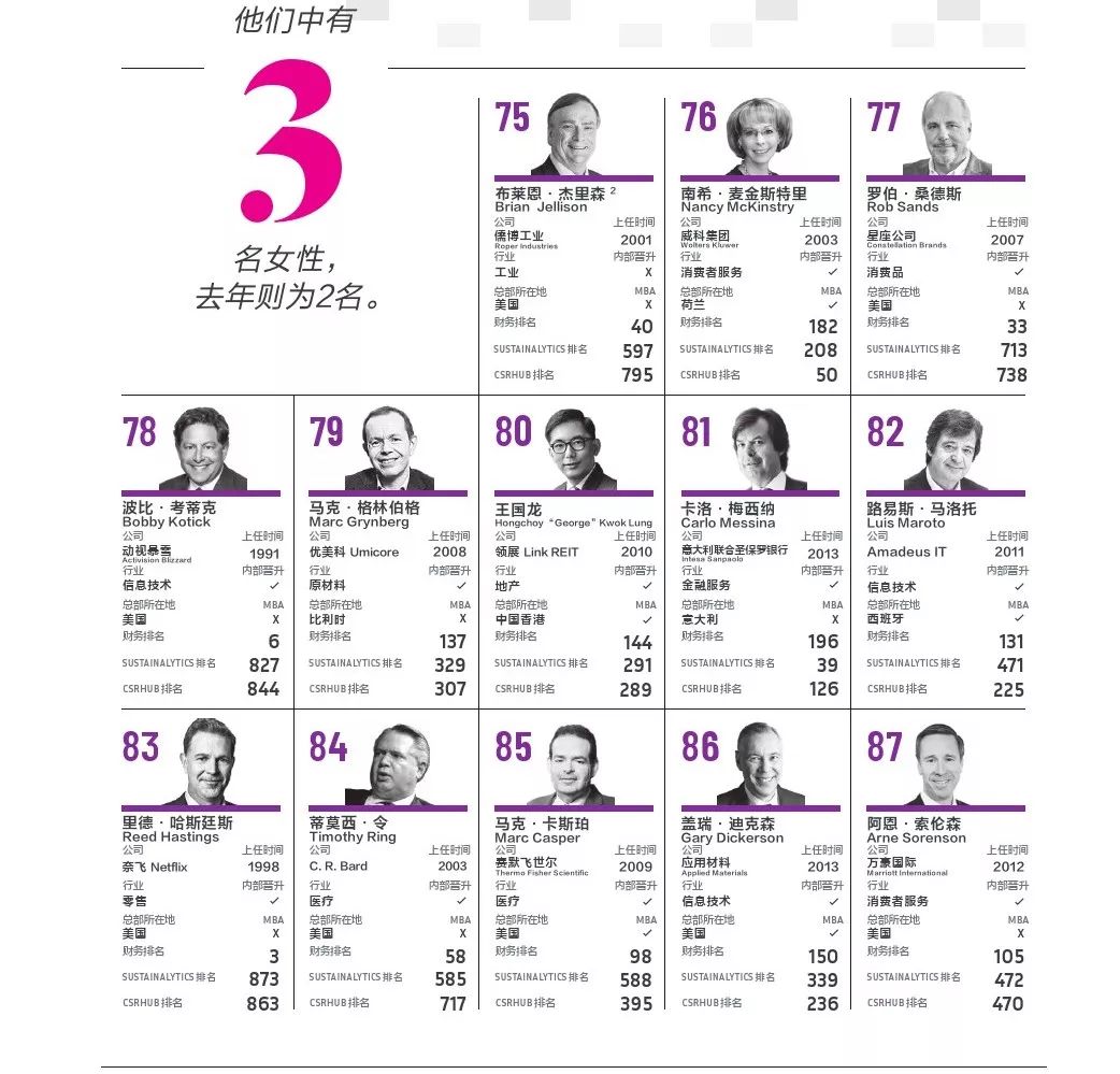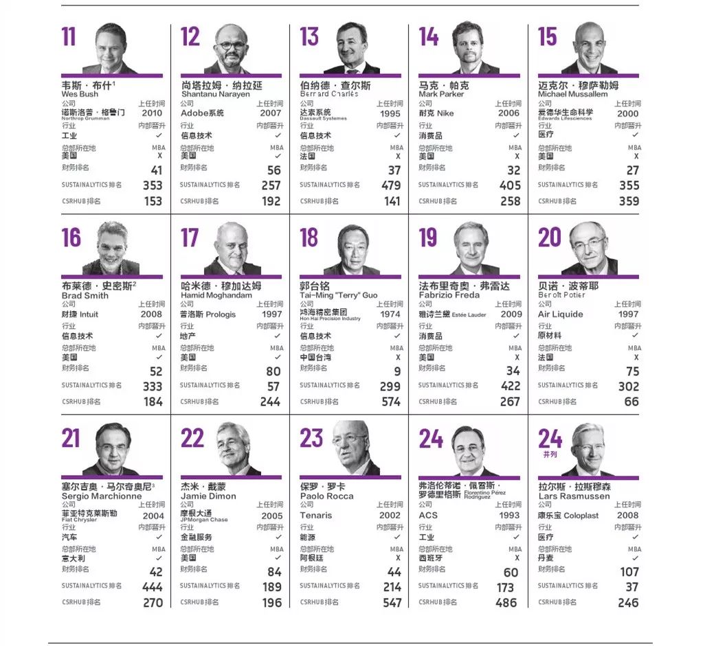 由此数据中的所有企业有两种ESG排名,其一是Sustainalytics排名,其二是CSRHub排名。财务排名权重占80%,两种ESG排名各占10%,并且剔除2018年6月30日前卸任的CEO,据此综合得出今年CEO排名的最终榜单。