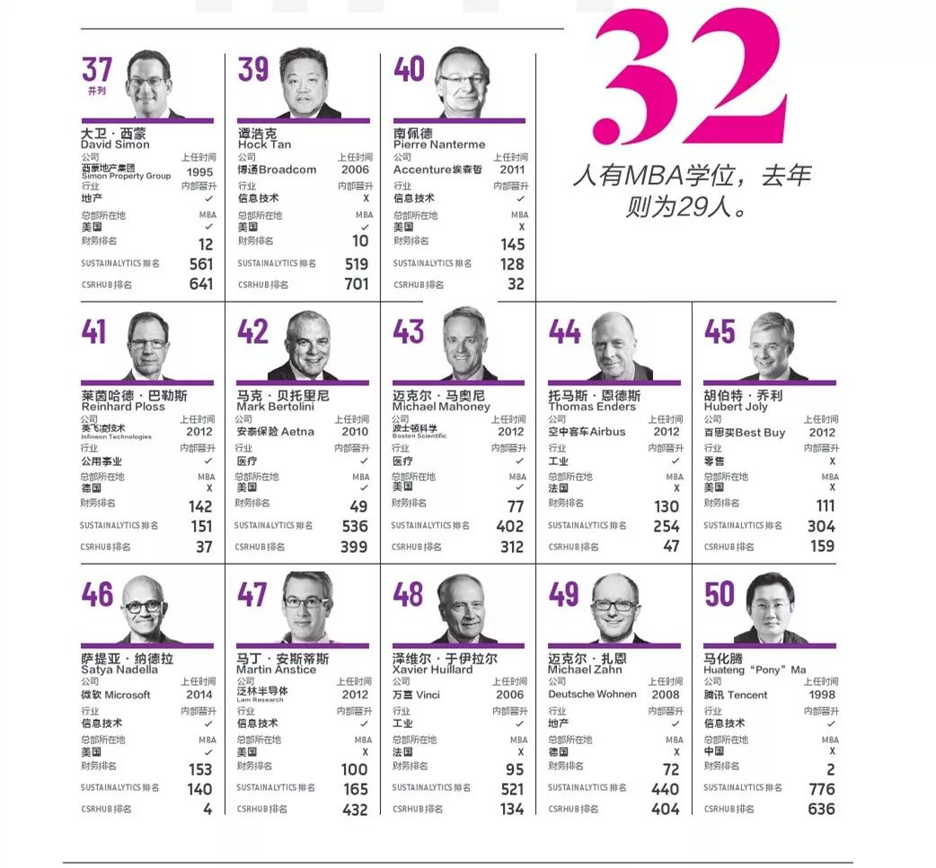 你可能知道,马化腾是过去三年唯一入选全球百佳CEO榜的中国内地企业家,2018年度排在全球榜单第50位,但你是否知道,全球百佳CEO榜单上到底有哪些企业家,他们上榜的理由是什么?