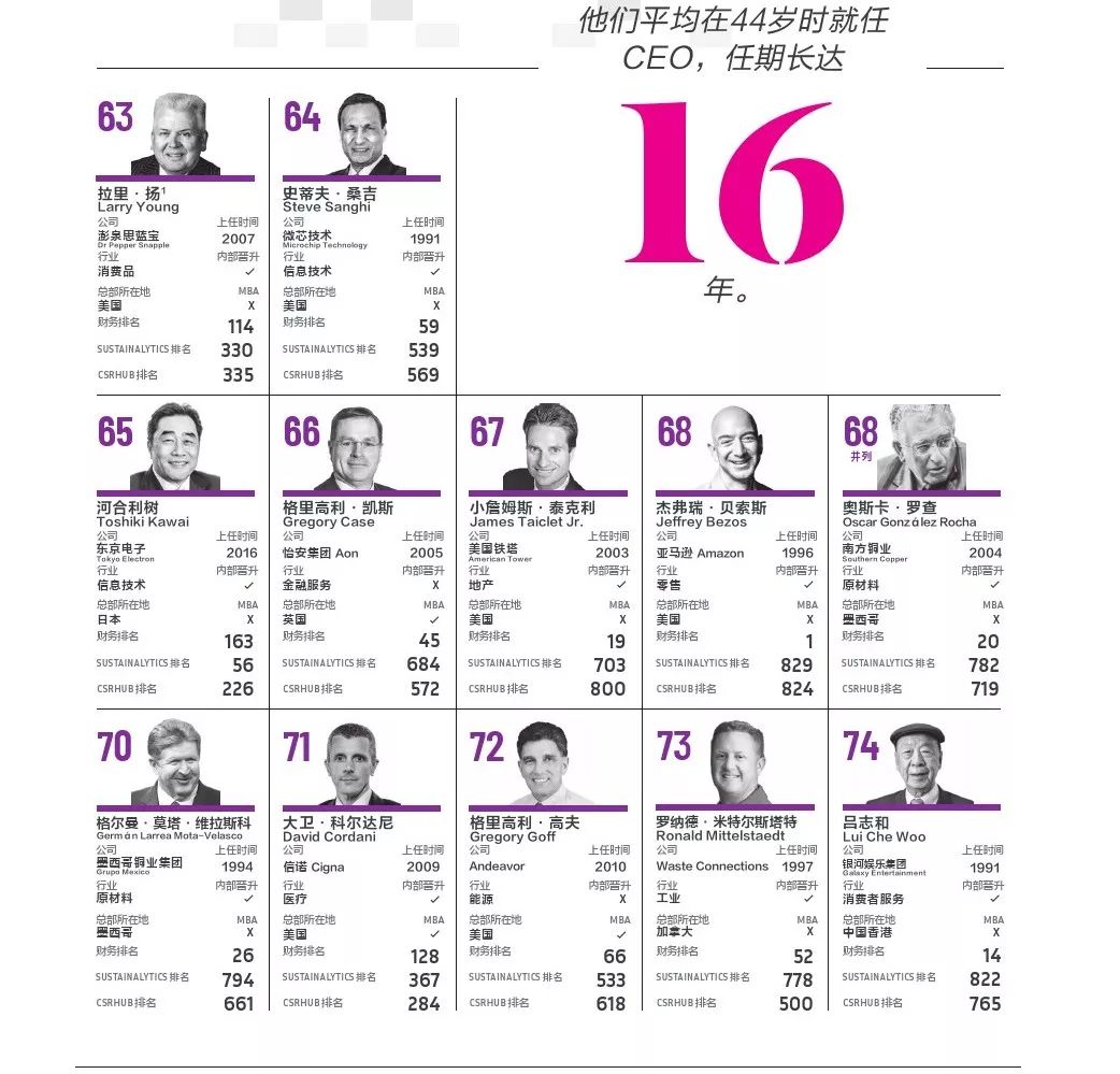 当前商业世界中,今日股价和本季度收入往往更受重视,而全球百佳榜单是评估每位CEO整个任期内的财务回报。入选榜单的CEO中,很多人任期极长。据统计,百佳榜单中的CEO平均任期为16年,而根据2017年数据,标普500公司的CEO平均任期是7.2年。