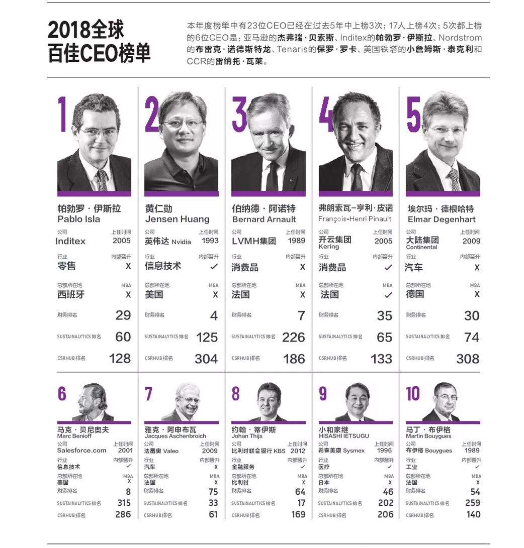 全球百佳CEO榜单的评选标准值得一提。2018年的评选沿用以往的绩效评估方法,关注CEO整个职业生涯的表现。