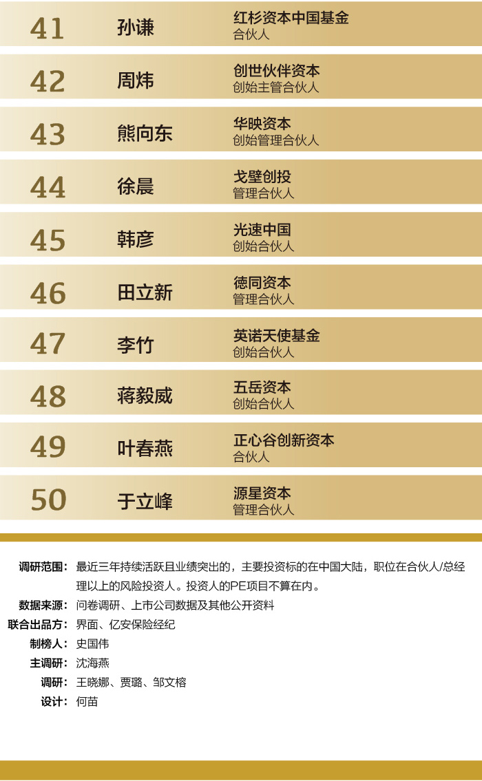 2018年11月22日,北京——界面联合亿安保险经纪第二次推出“中国顶级风险投资人”榜单。我们主要考察主流/活跃风险投资人过去三年的新投及退出项目。根据其业绩,及其在该投资项目中的参与度和贡献,评选出50位年度顶级风险投资人。