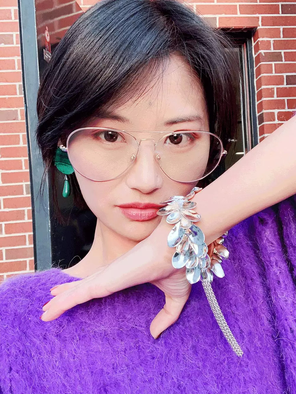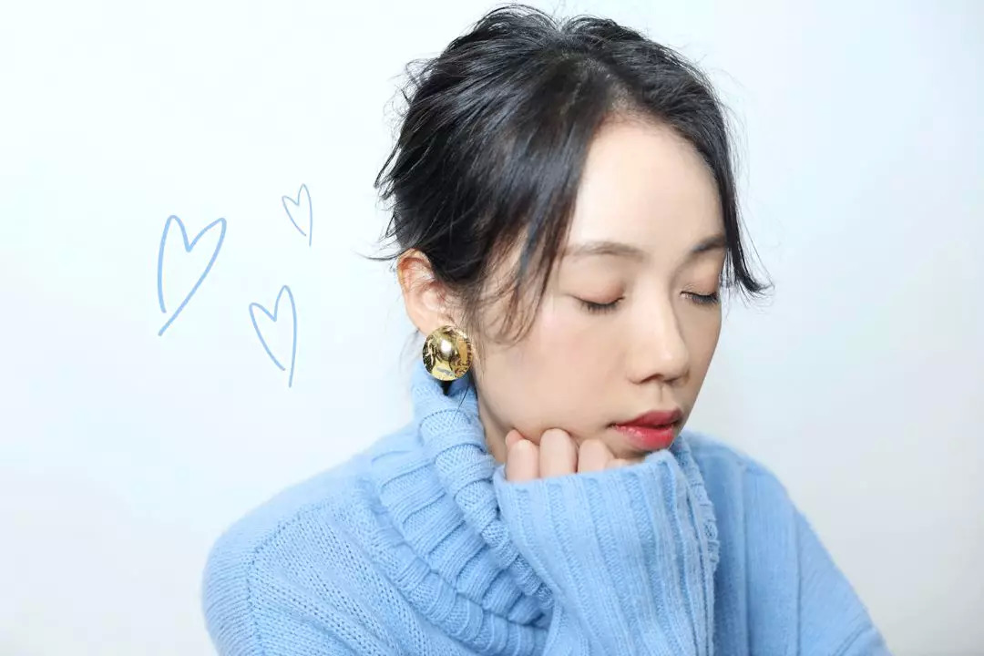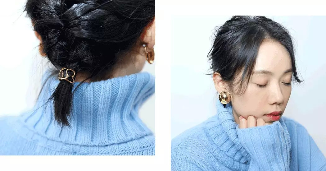 不过穿这种毛衣尽量把头发扎起来,显得干净一点。造型师给她梳了个鱼骨辫,再在小辫子上戴了一枚戒指。一物二用~耳环戴的是这款金属小贝壳。
