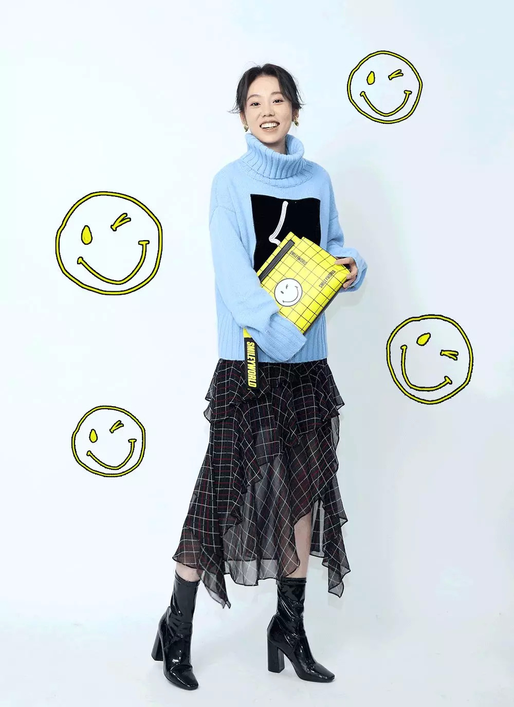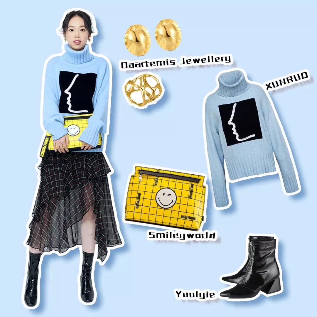 我选的是宽松的高领毛衣,暖暖的,懒懒的。搭配材质反差很大的不规则格子纱裙,时髦成欧阳娜娜本娜。亮黄的信封笑脸包给这身加了个亮点。