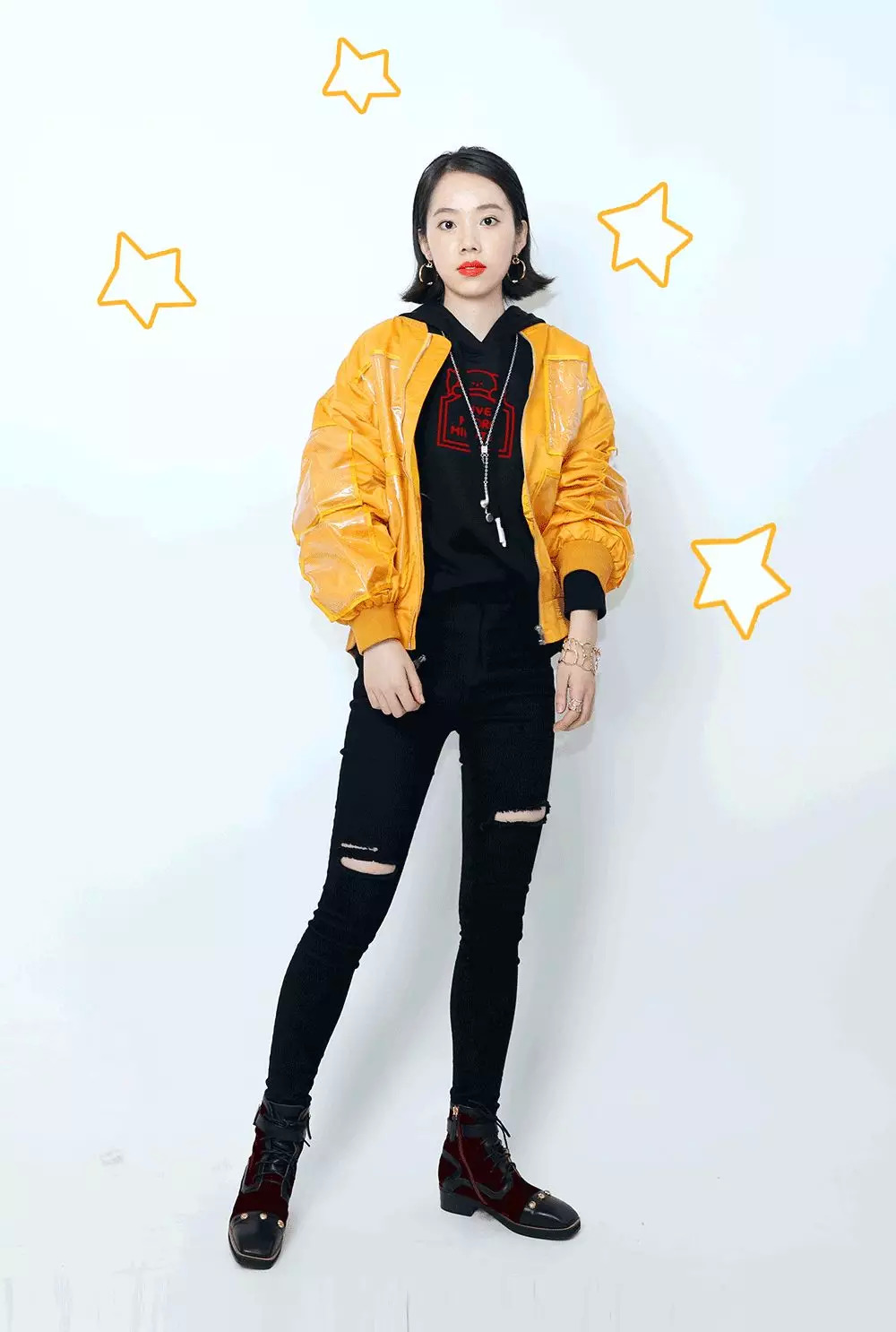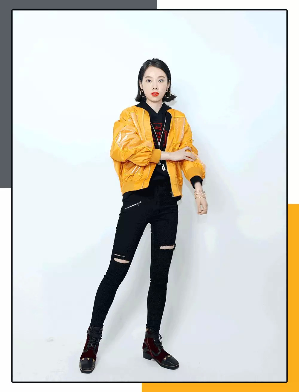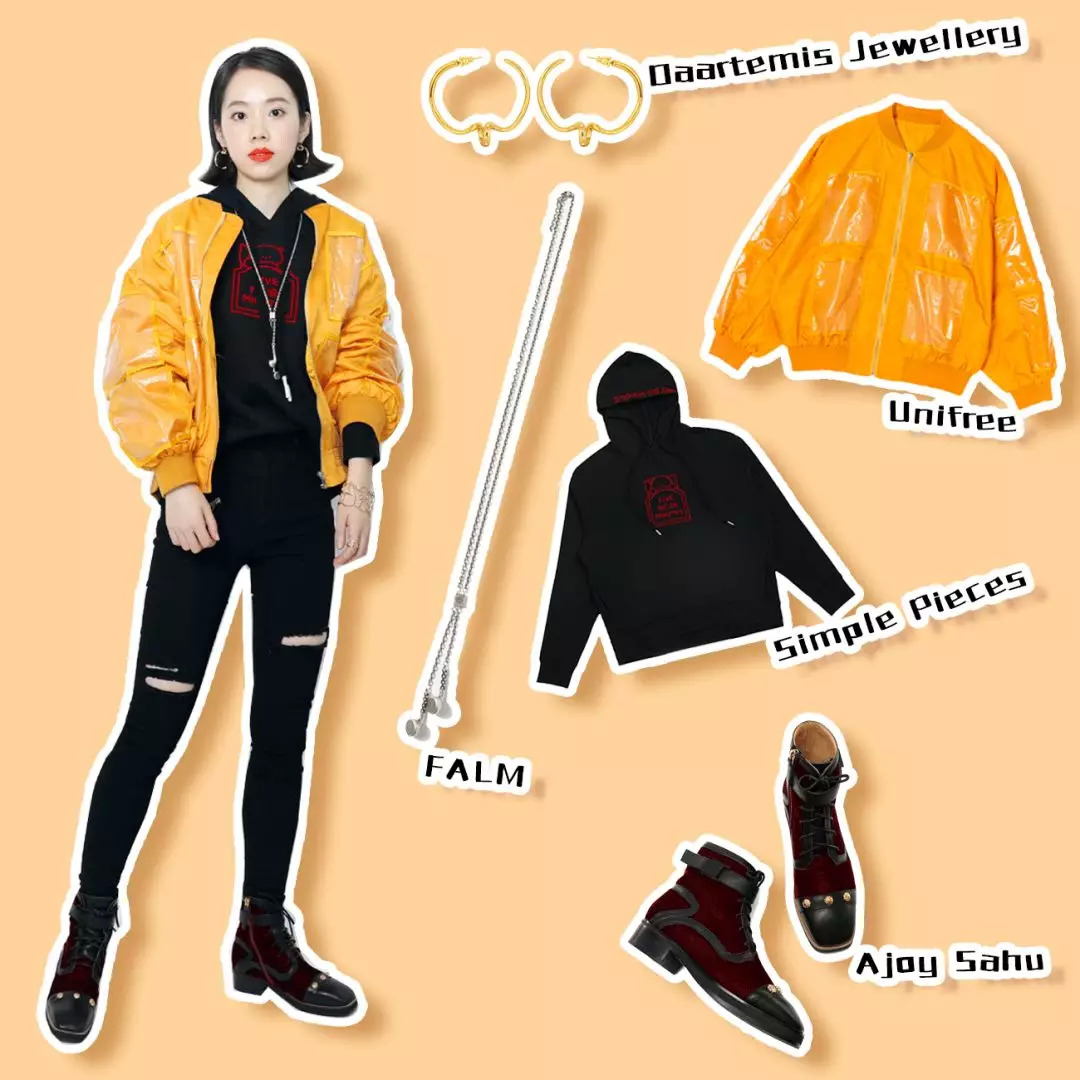 她说他很喜欢黄色,给她搭了件都是PVC口袋的工装外套,里面穿一身黑的卫衣、破洞裤,这样穿感觉整个人窄长不少。