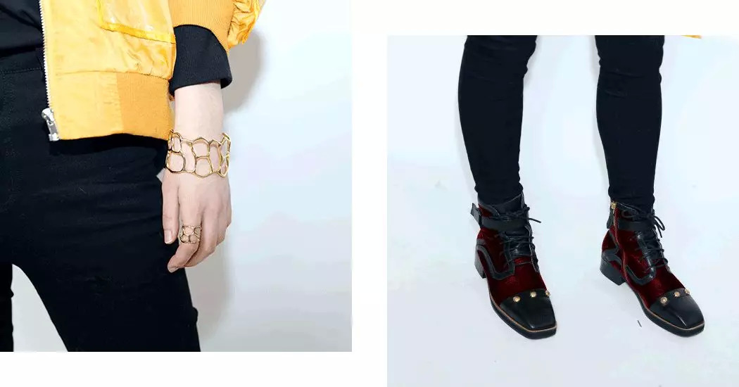 丝绒马丁靴上面的金扣也很抢眼。