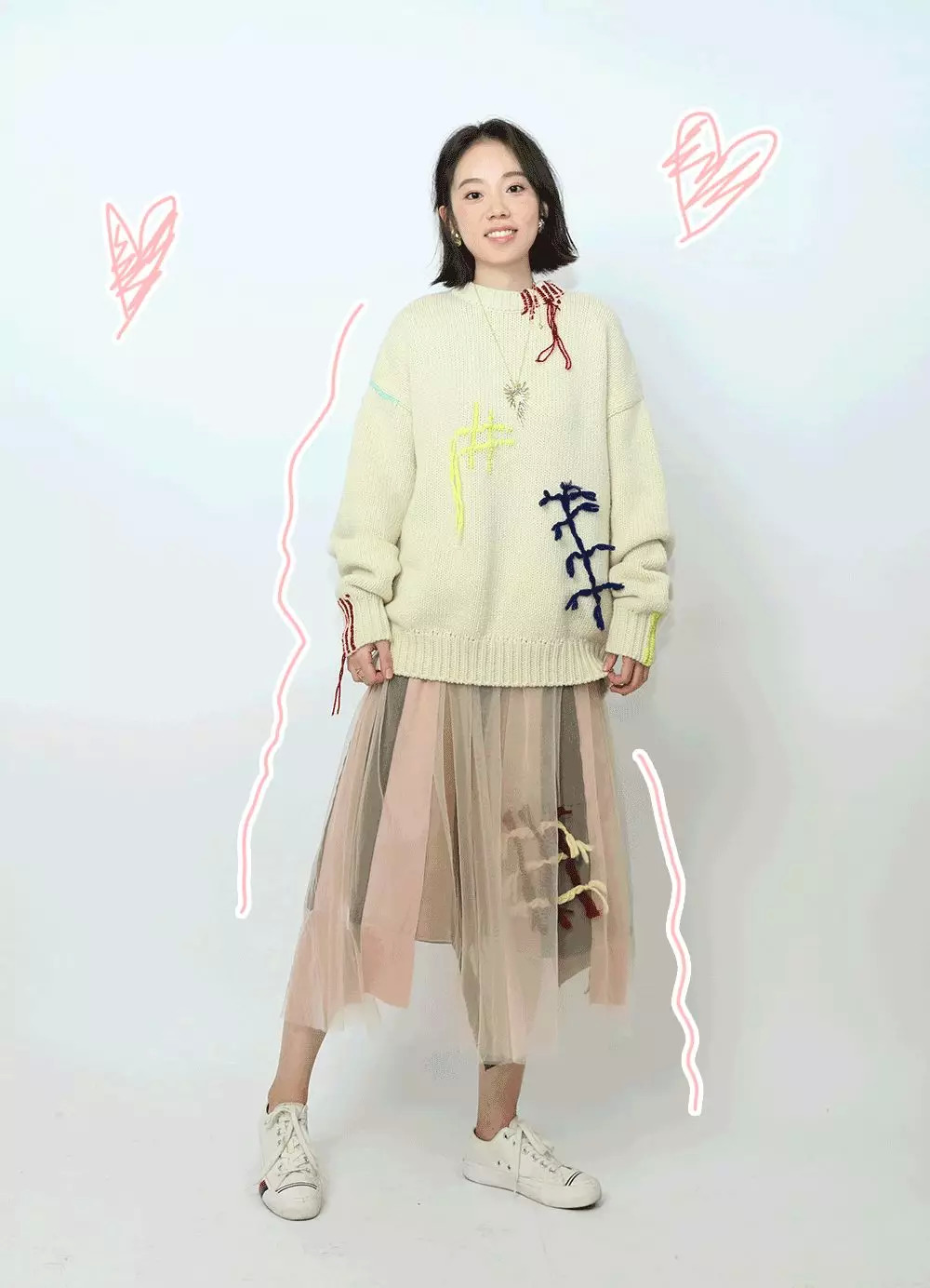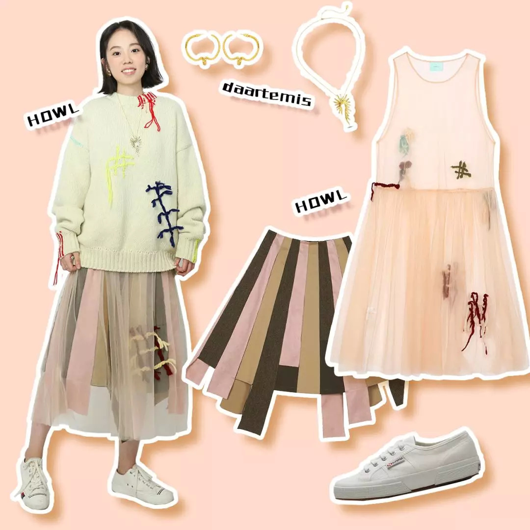跟着这个思路走,她又选了条布条拼接半身裙,外面罩了层有毛线装饰的网裙。