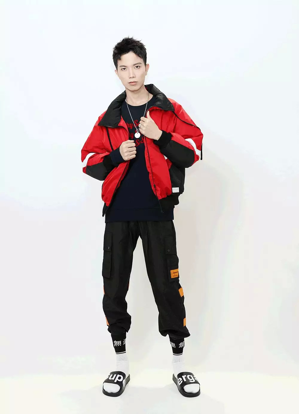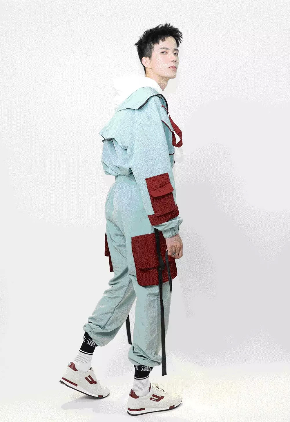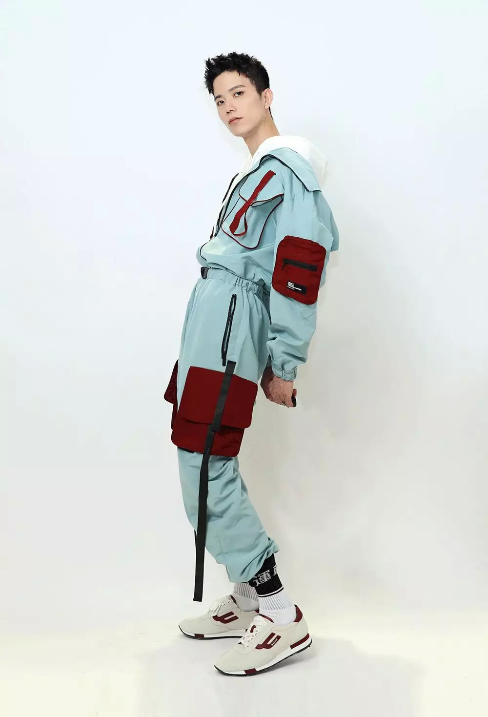 化完妆,终于到我上场的时候了~我给他整了一套FLAM的机能风工装套装,撞色的暗红色大口袋,和满身挂着的织带,本身就蛮特别的。