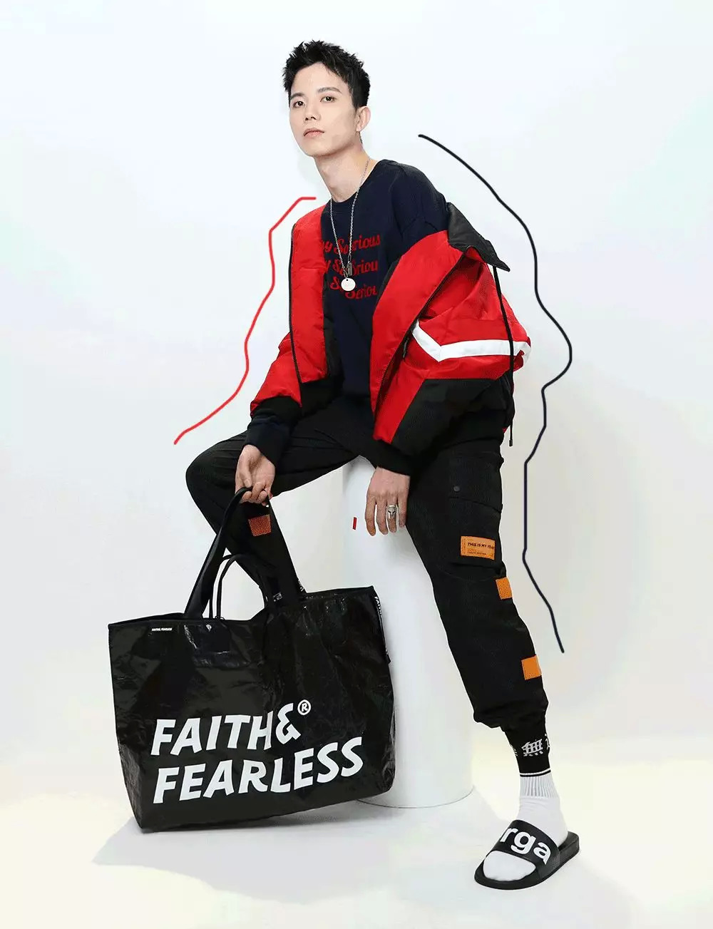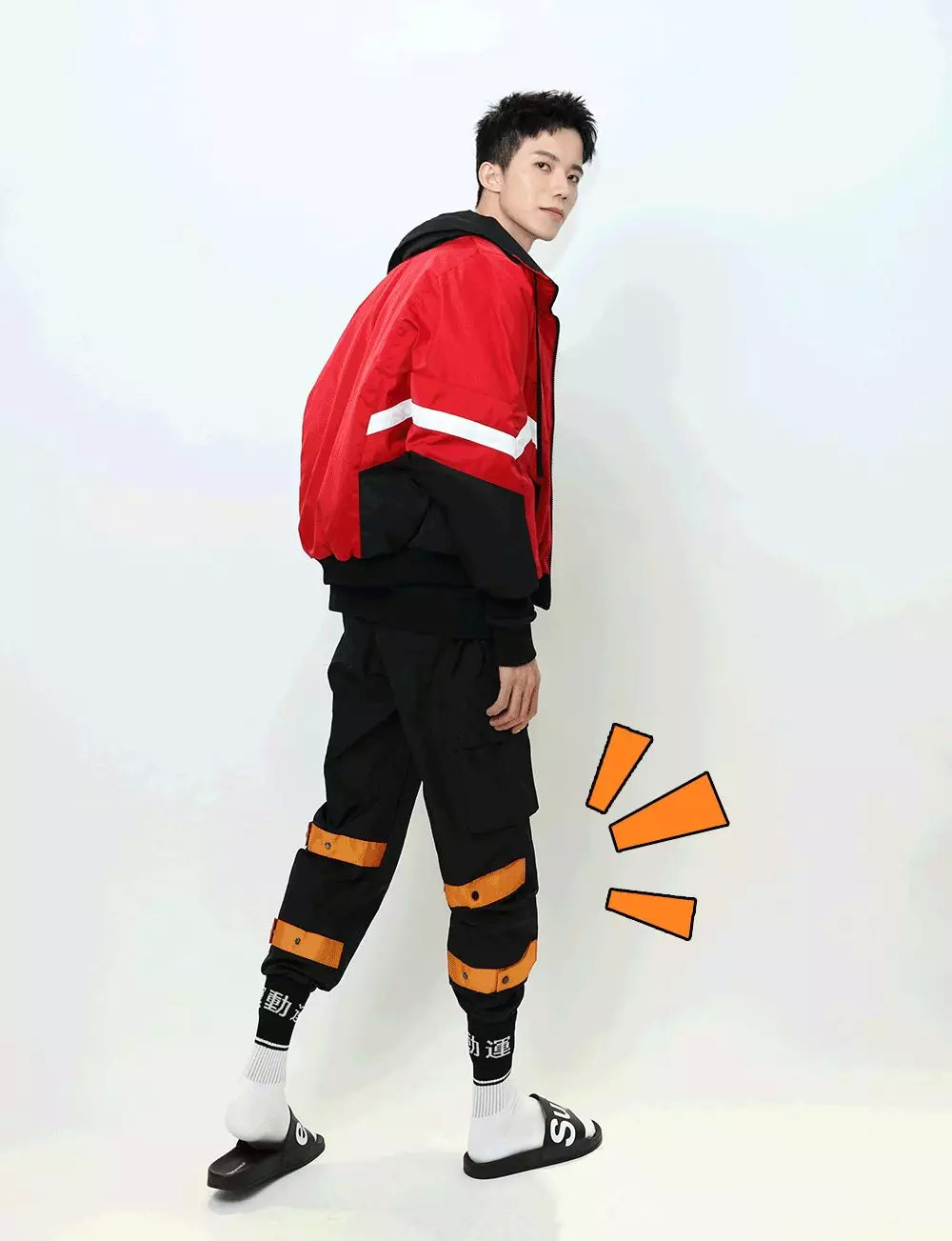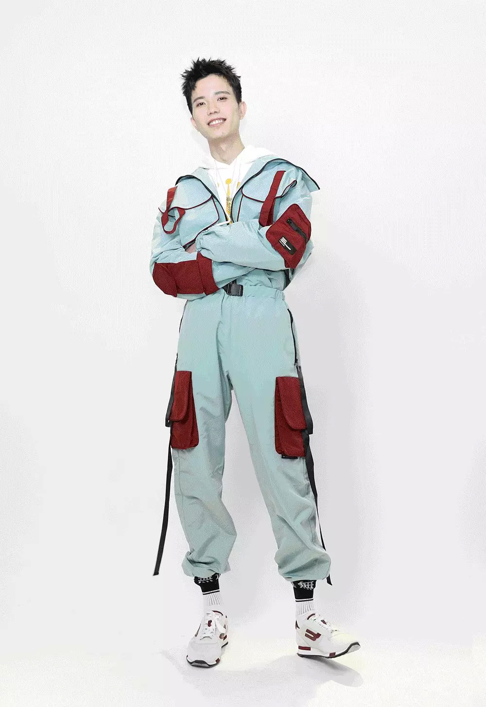 化完妆,终于到我上场的时候了~我给他整了一套FLAM的机能风工装套装,撞色的暗红色大口袋,和满身挂着的织带,本身就蛮特别的。