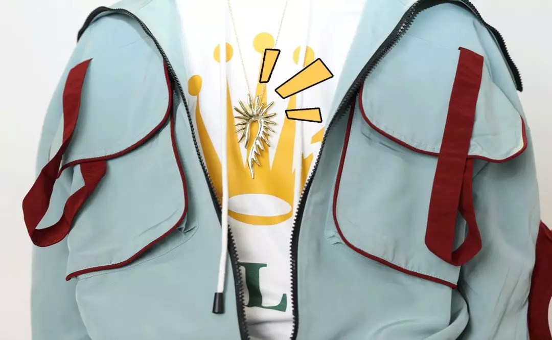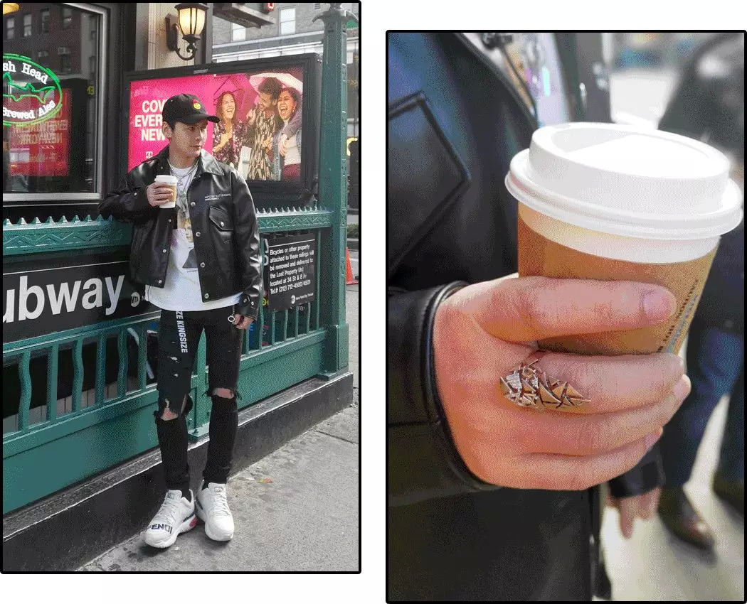 卫衣外面套了条时髦的金链子。两只手各戴了很有设计感的戒指。