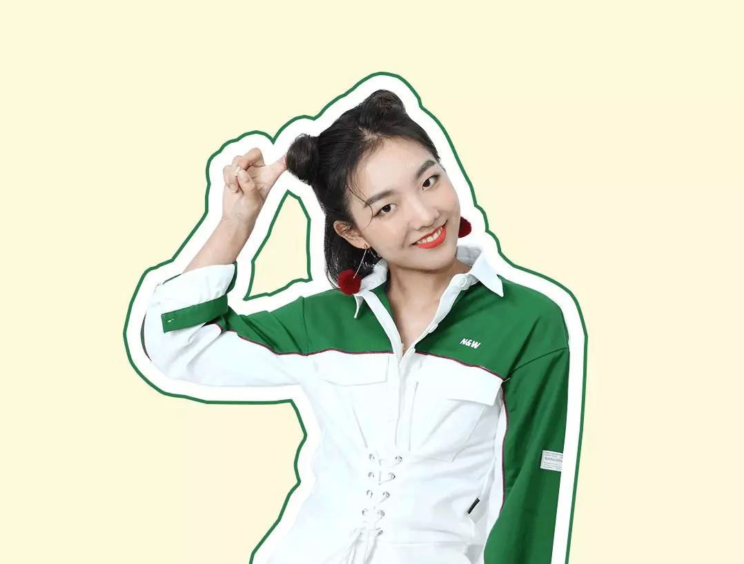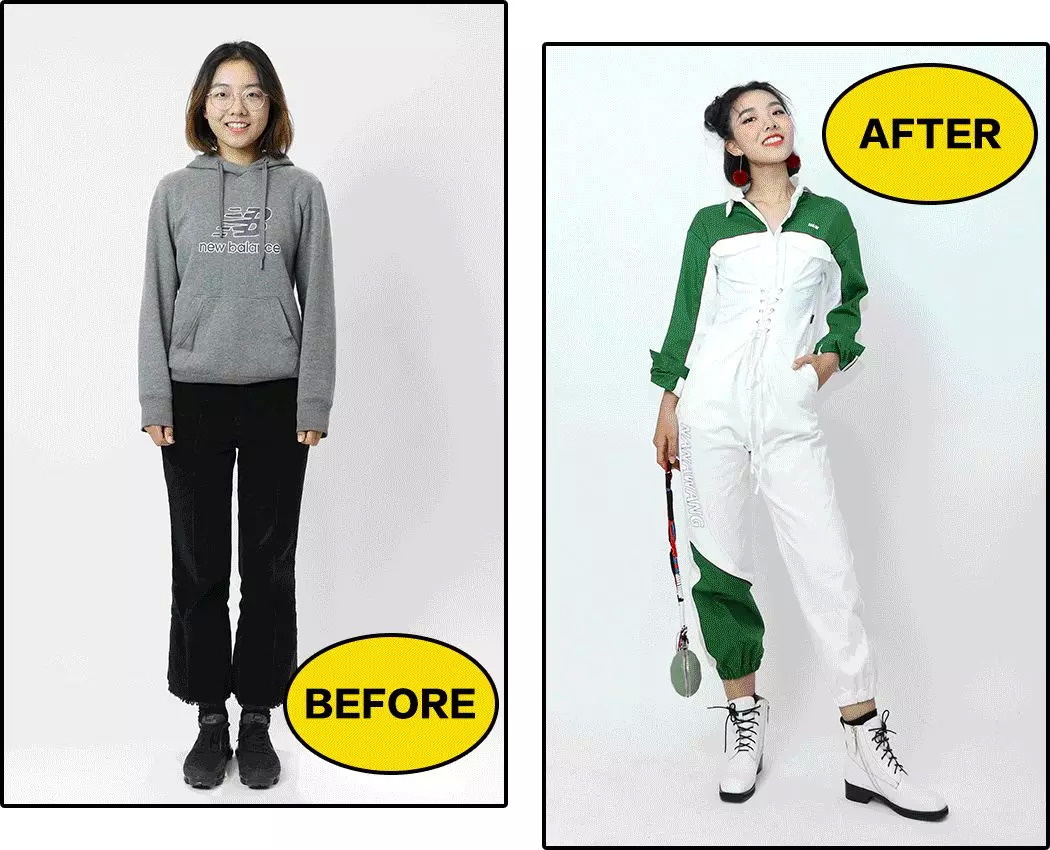 我让造型师帮她梳上时髦的哪吒头,眉毛画得粗点显脸小。眼妆帮她保留了有特色的单眼皮。开始帮她改造。