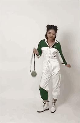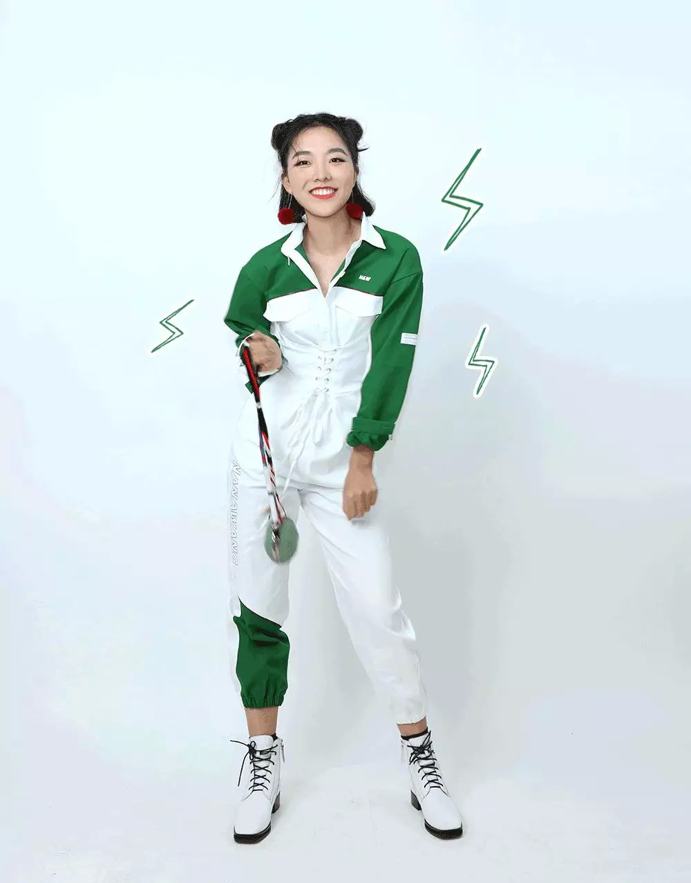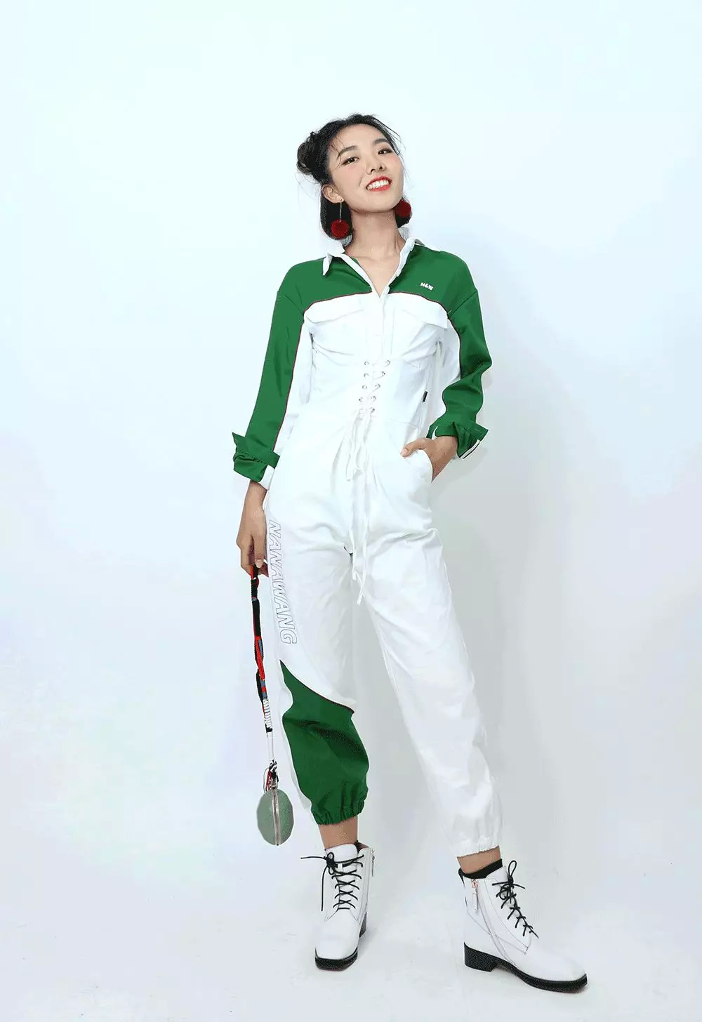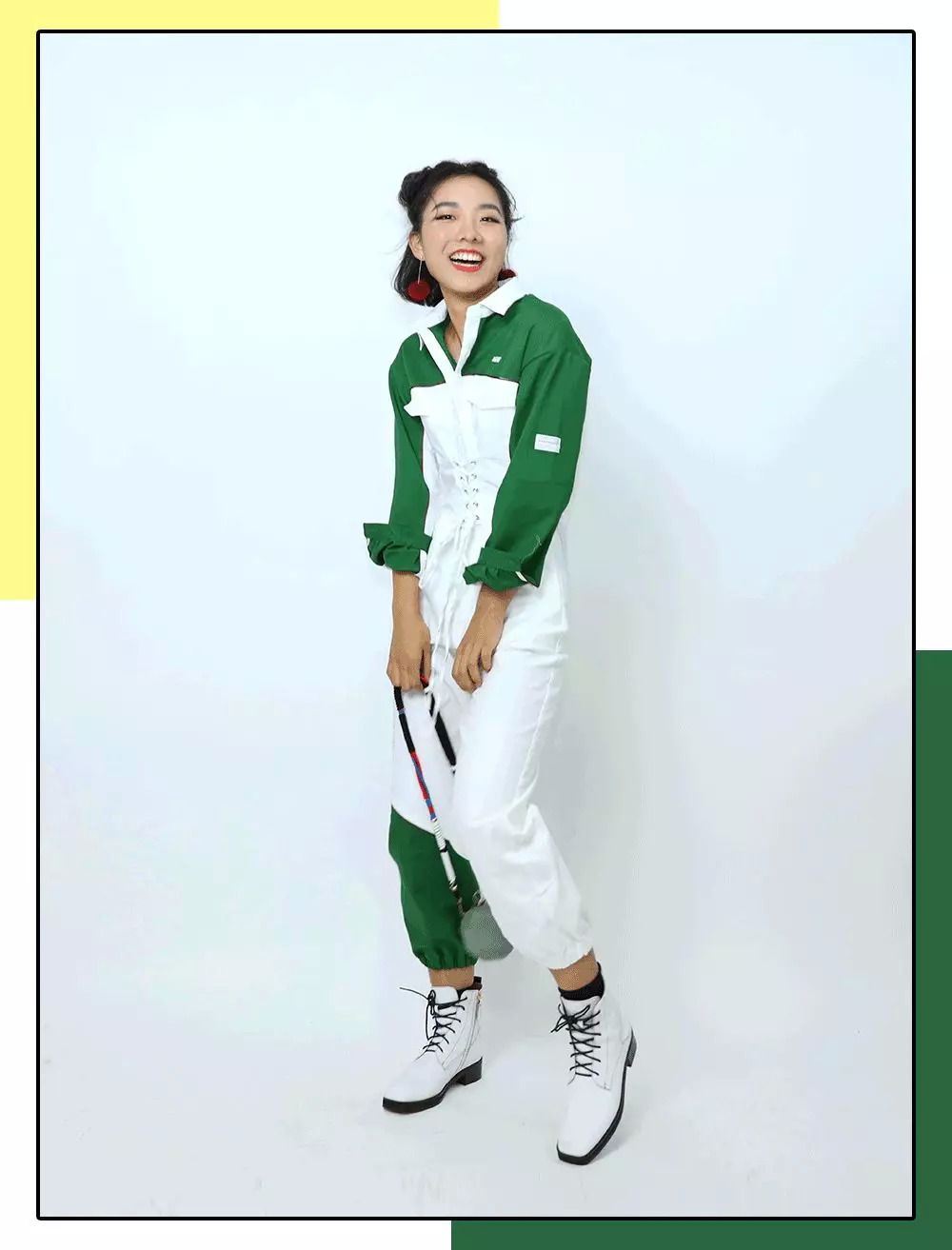 比起男生,她更适合没那么硬气的工装。给她选了条拼色连体裤,廓形很好,显得肩宽腿长,最主要腰上自带腰封,把小细腰大写加粗地强调一遍。