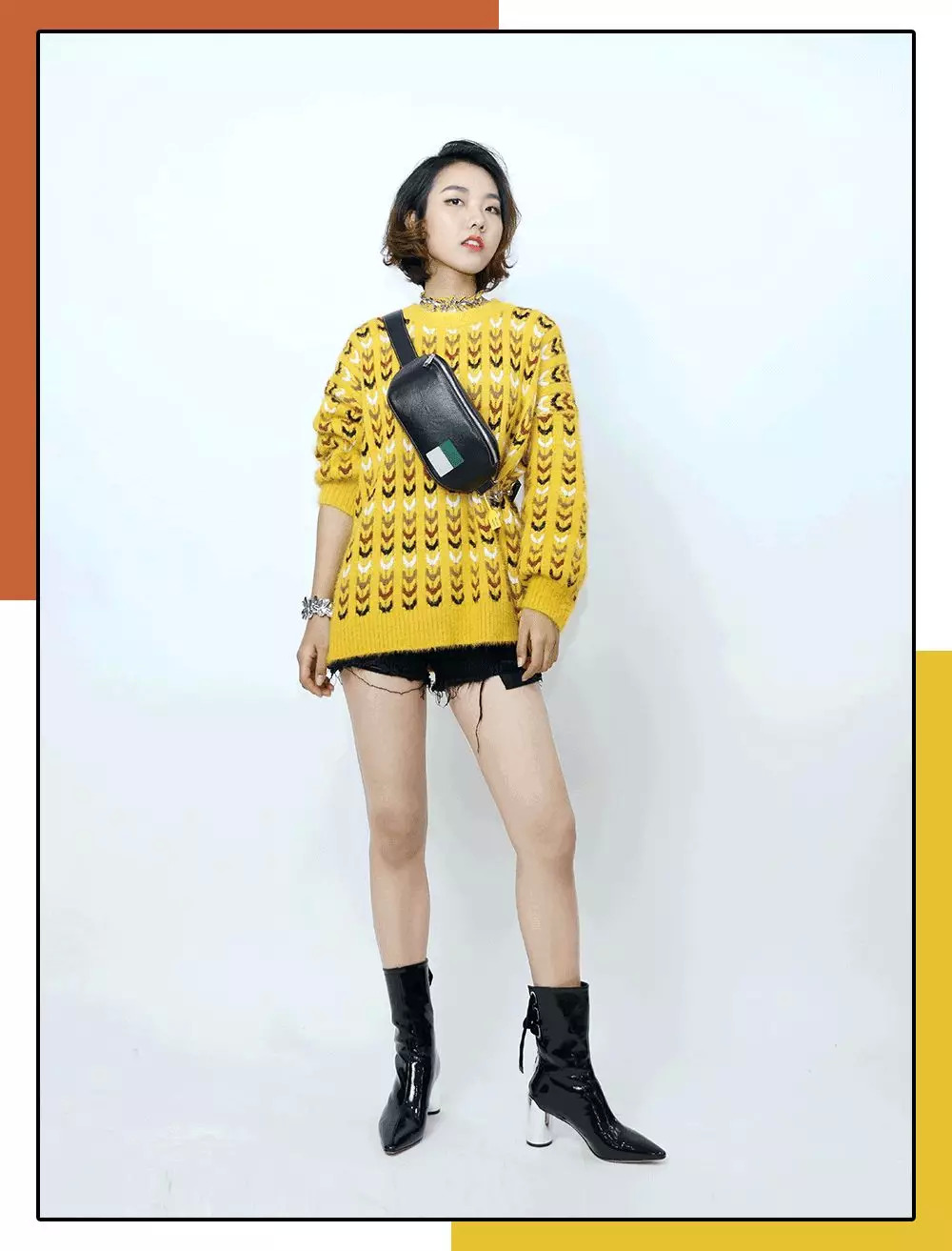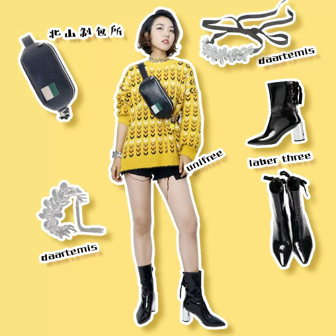 搭拼色麻花的黄色毛衣和很显腿长的撕边短裤,酷女孩指数飙增。