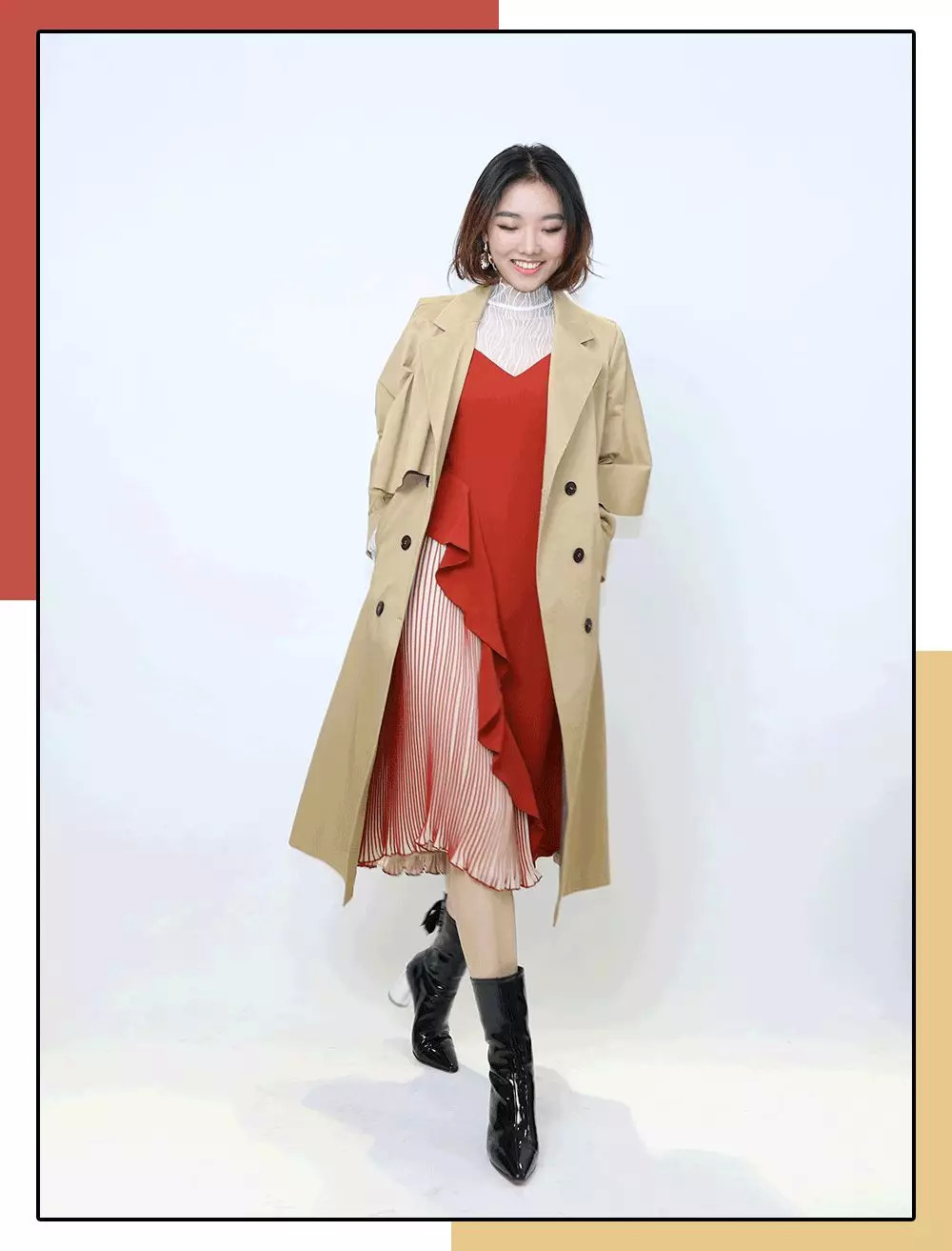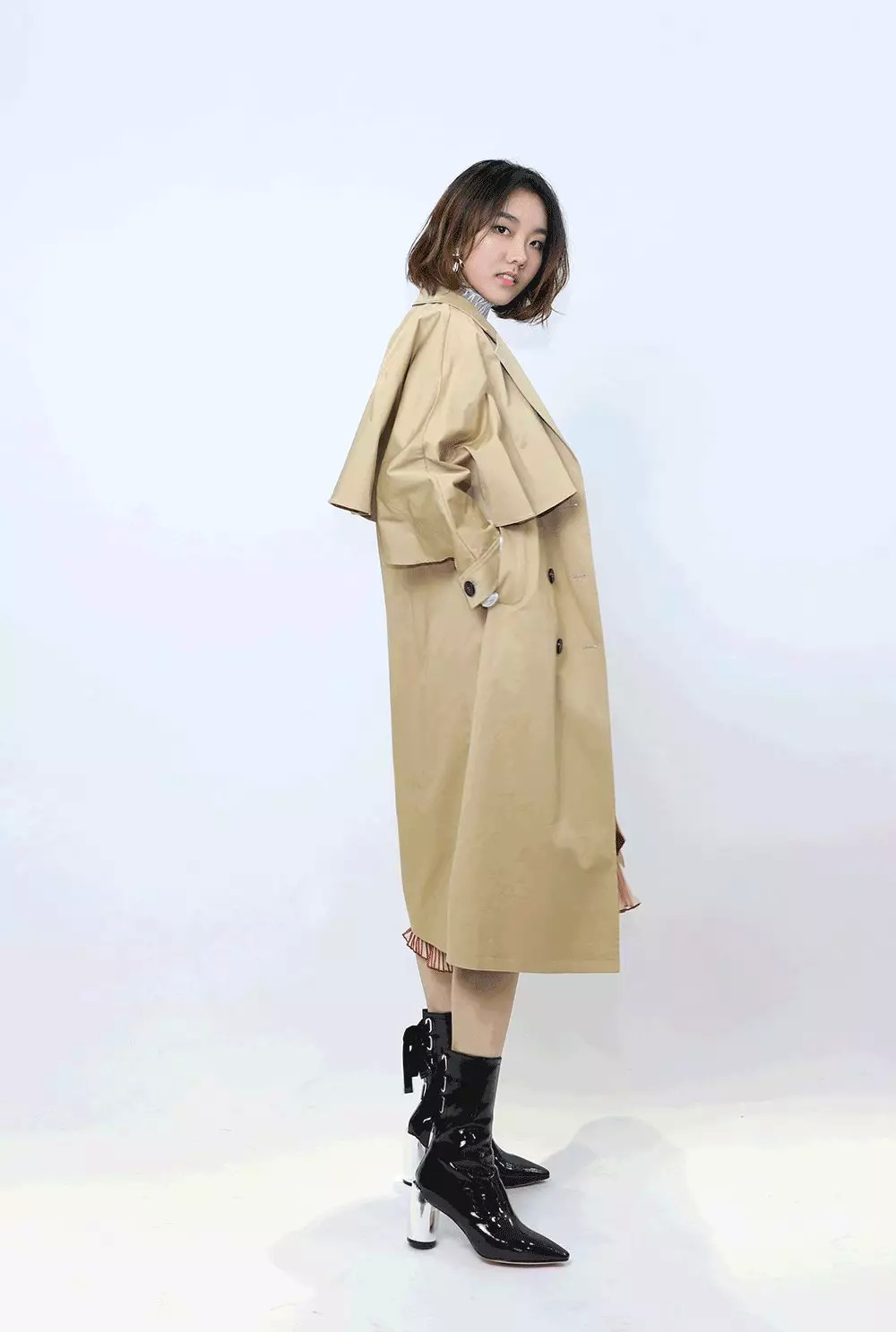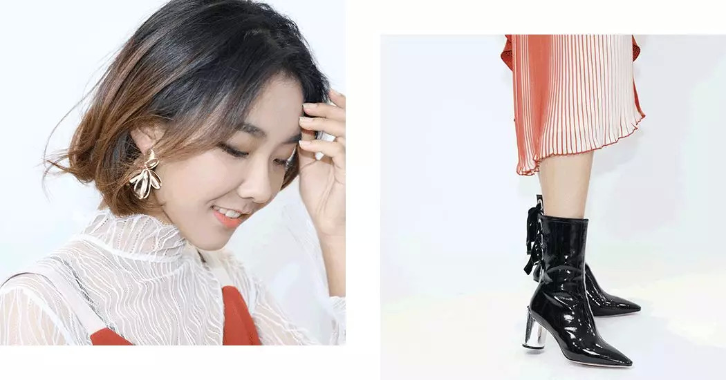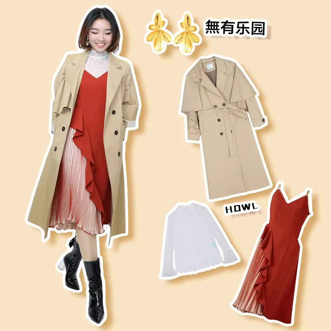 披上风衣就是气质满分的金秘书。中筒靴选了上套造型里穿过的那款,大胆露腿肚子的,真的一点也不粗~配饰选了立体的花瓣耳环。