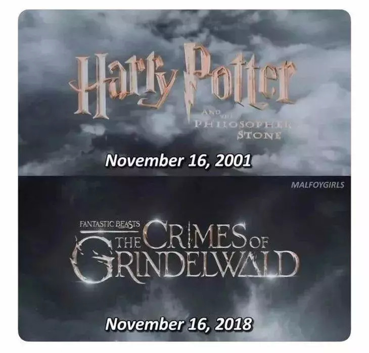 (资深影迷发现,《神奇动物2》与17年前的《哈利·波特与魔法石》上映时间为同一天)