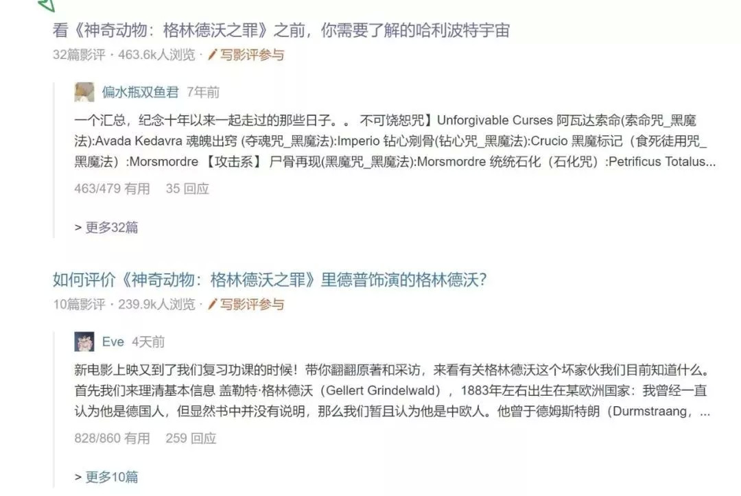 而这样的解读者,在豆瓣、微博、微信公众号等社交媒体中不是少数。目前仅豆瓣中,就有4.6w短评,其中关于哈利波特宇宙的科普贴或扫盲贴就不下百篇。而热门影评中某一篇的浏览量就达到了463.6K。