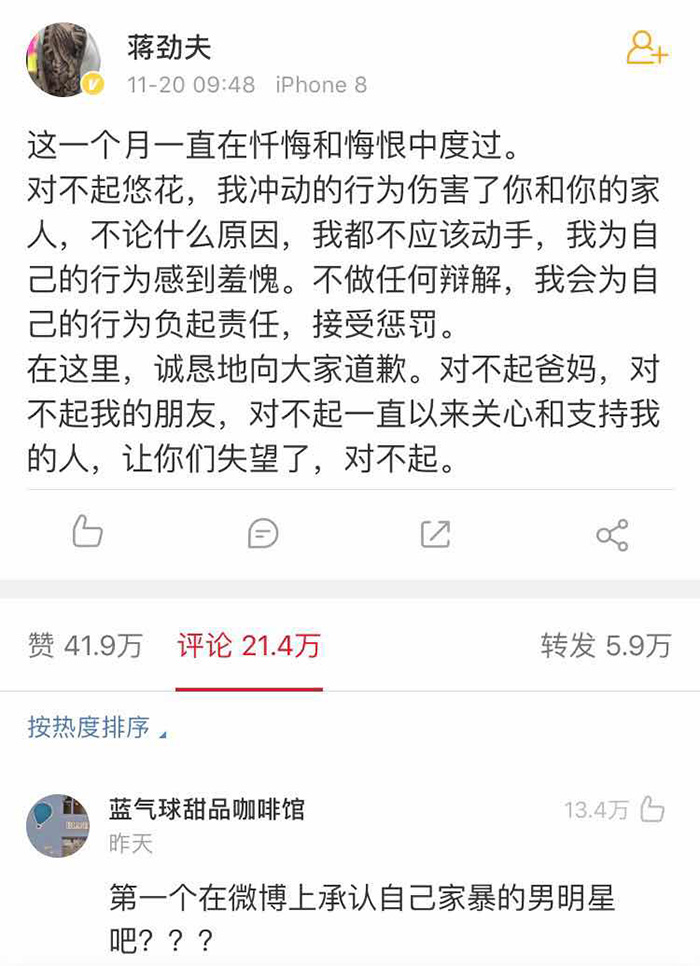 蒋劲夫本人随后也在微博上承认家暴并向网友道歉。