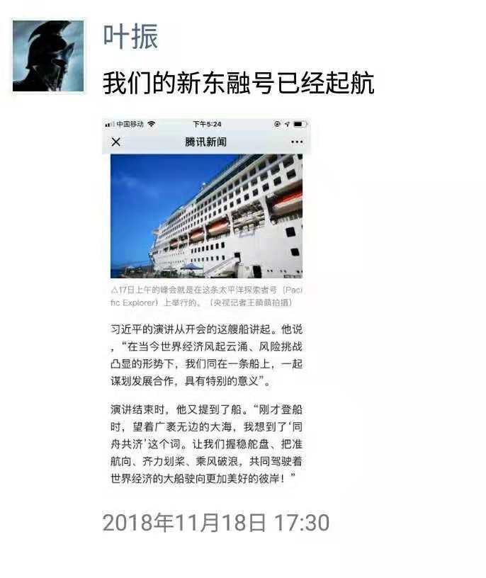 11月17日,记者看到东融创始人叶振的微信朋友圈更新:“我们的新东融已经起航”,东融集团既成过往?