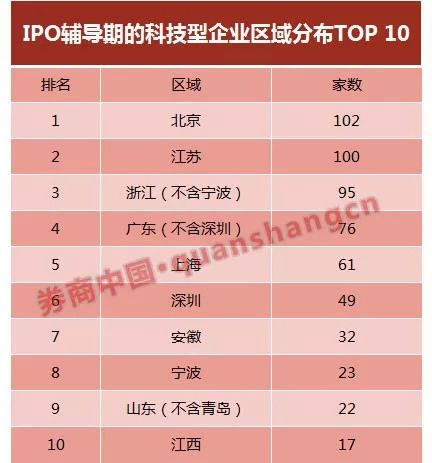 据此,券商中国记者对93家投行目前进入IPO辅导期的储备项目进行了不完全统计和梳理后发现,1699个进入IPO辅导期的企业中,符合上述要求的储备项目有729个。其中,北京、江苏、浙江(不含宁波)、广东(不含深圳)、上海、深圳、安徽、宁波、山东(不含青岛)和江西最多,位居前十。北京江苏和浙江分别多达102个、100个和95个,上海本地进入IPO辅导期的科技型企业项目数也达到了61个,广东地区如果算上深圳则稳居第一,数量多达125个。