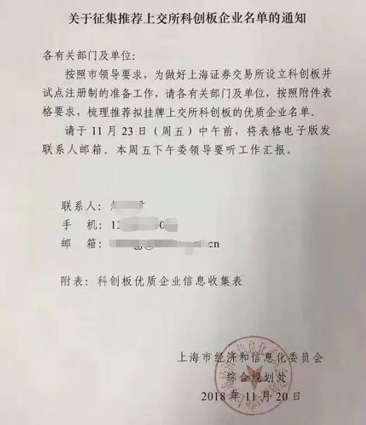券商中国记者独家获得的上海经信委发给上海辖区相关部门和单位的通知表示,按照市领导要求,为做好上交所设立科创板并试点注册制的准备工作,要求各有关单位及部门按要求,梳理并推荐拟挂牌科创板的优质企业名单。